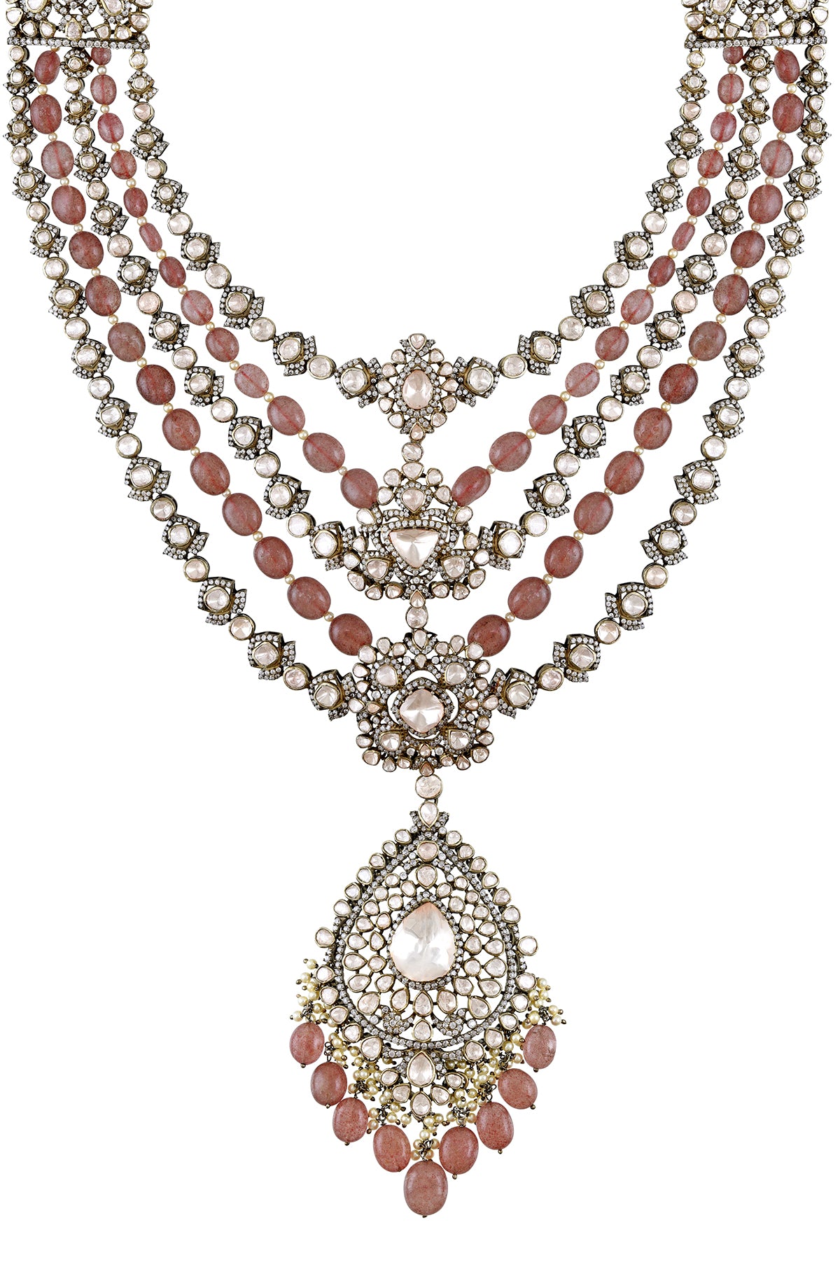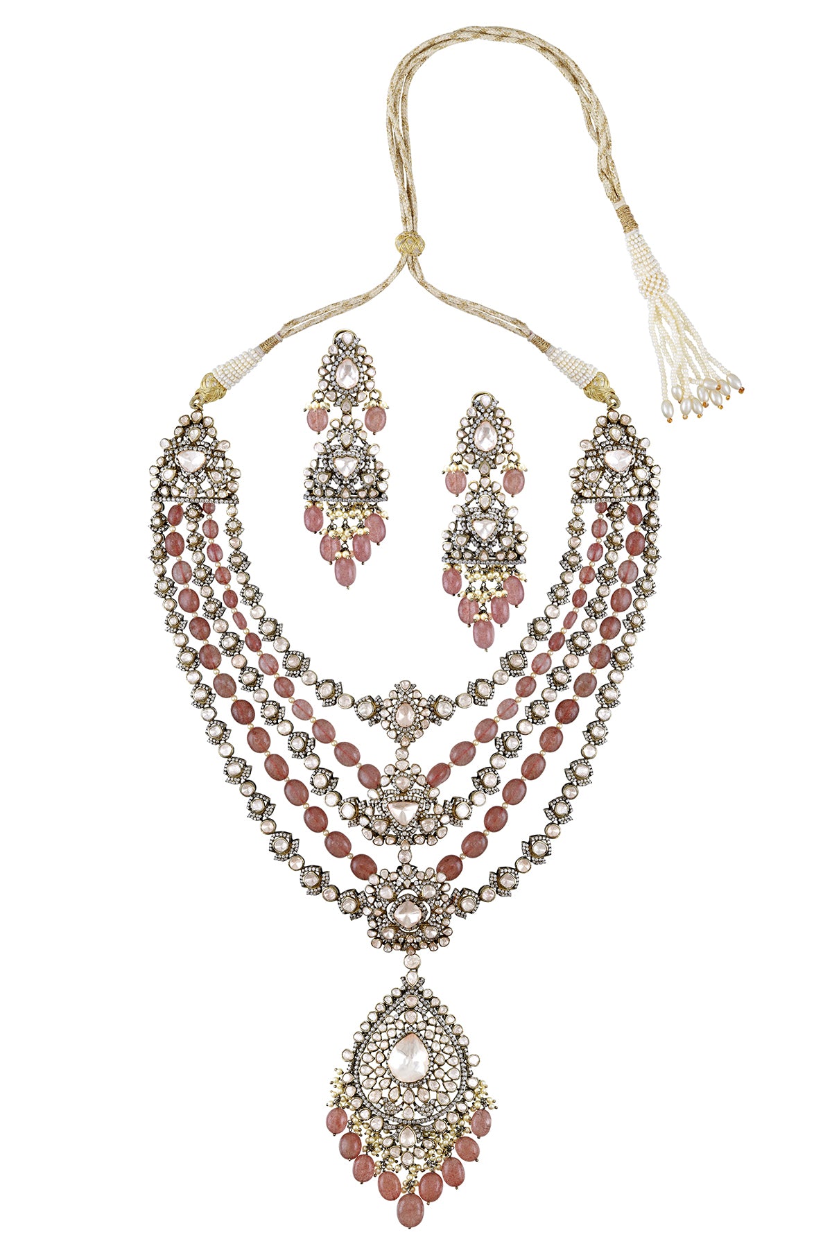 Royal gold plated glass and pearl layered necklace set is a perfect choice for a royal wedding look. Shop Amrapali jewelry from Pure Elegance in India.