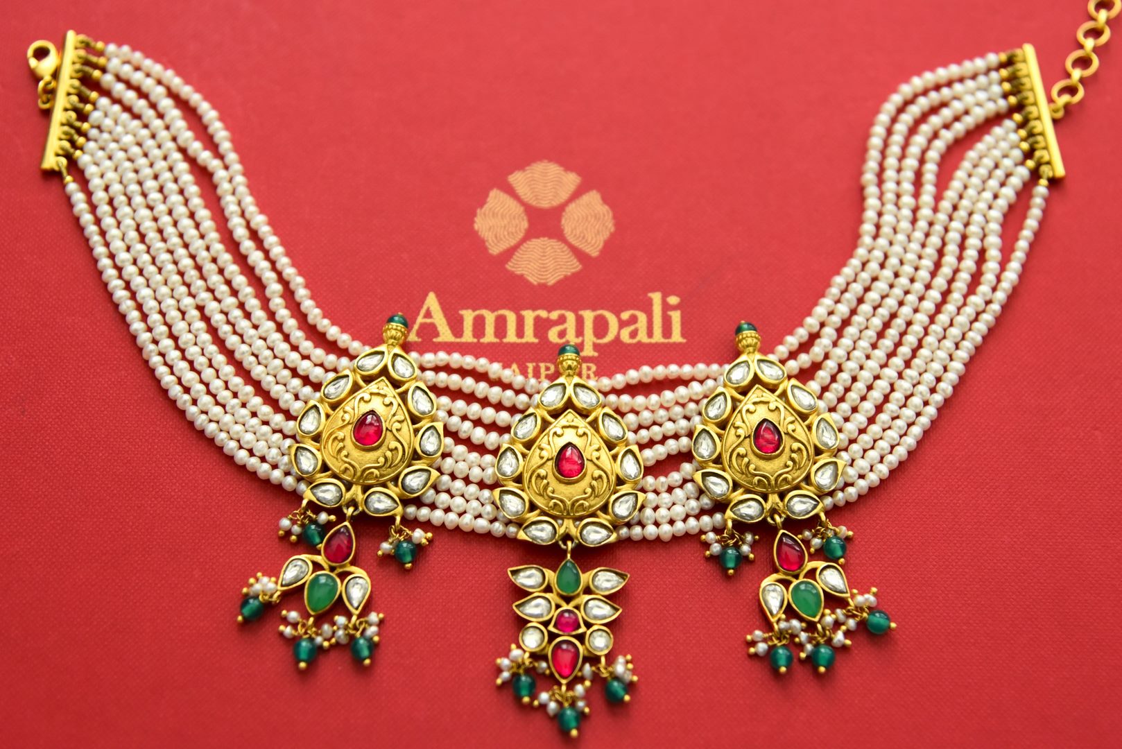 Elegant gold plated kundan motifs pearl choker. Shop Amrapali jewelry in USA from Pure Elegance.