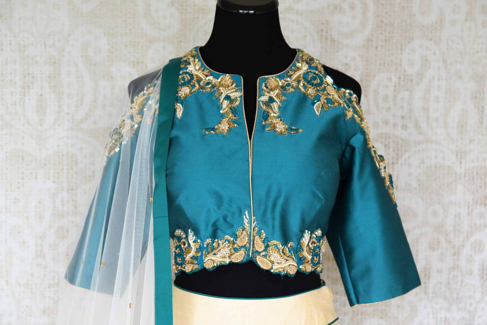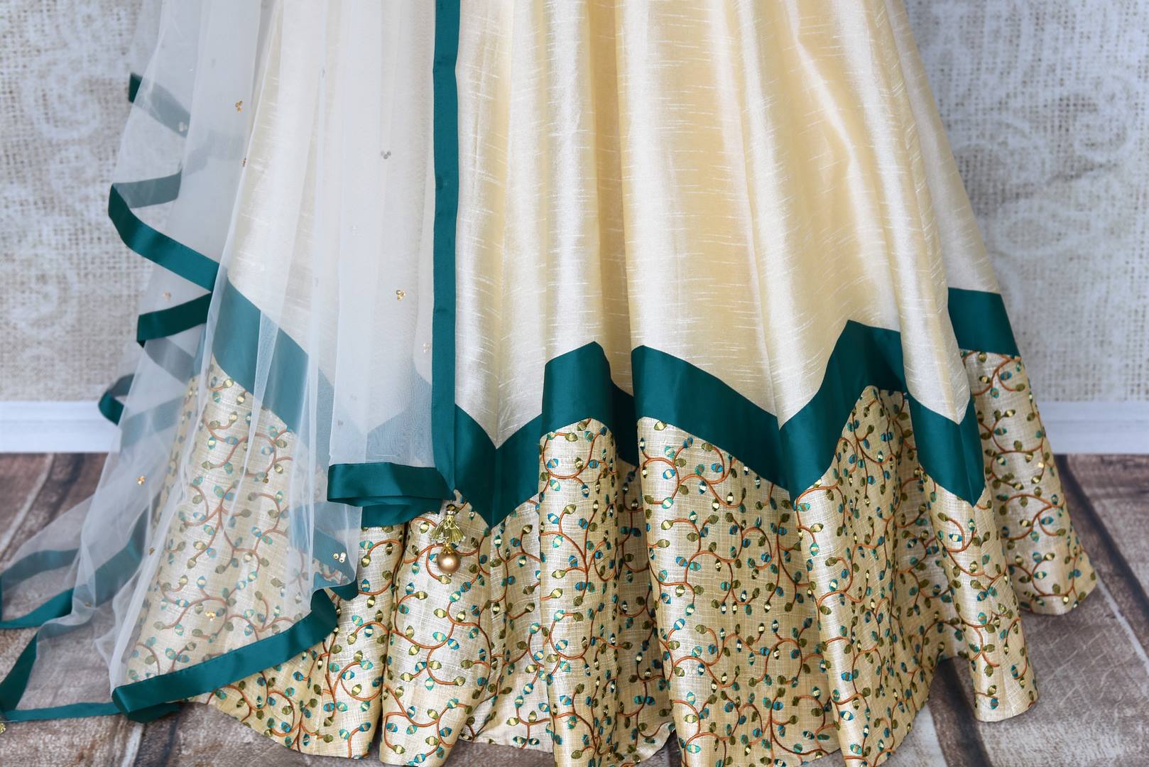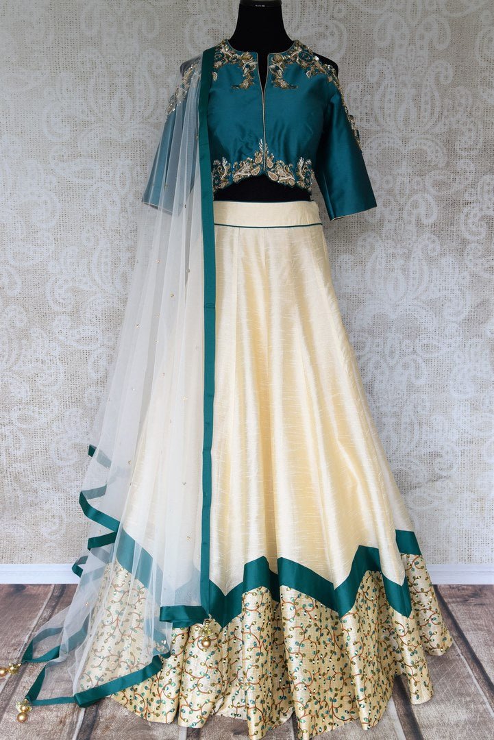 Rock your dreamy affair with cream silk net embroidery lehenga paired with cream sheer net dupatta. The intricately handcrafted embroidery on the emerald painted blouse gives a striking combination to the haute couture. You can dance all night long and put your glam face forward in this gorgeous attire.