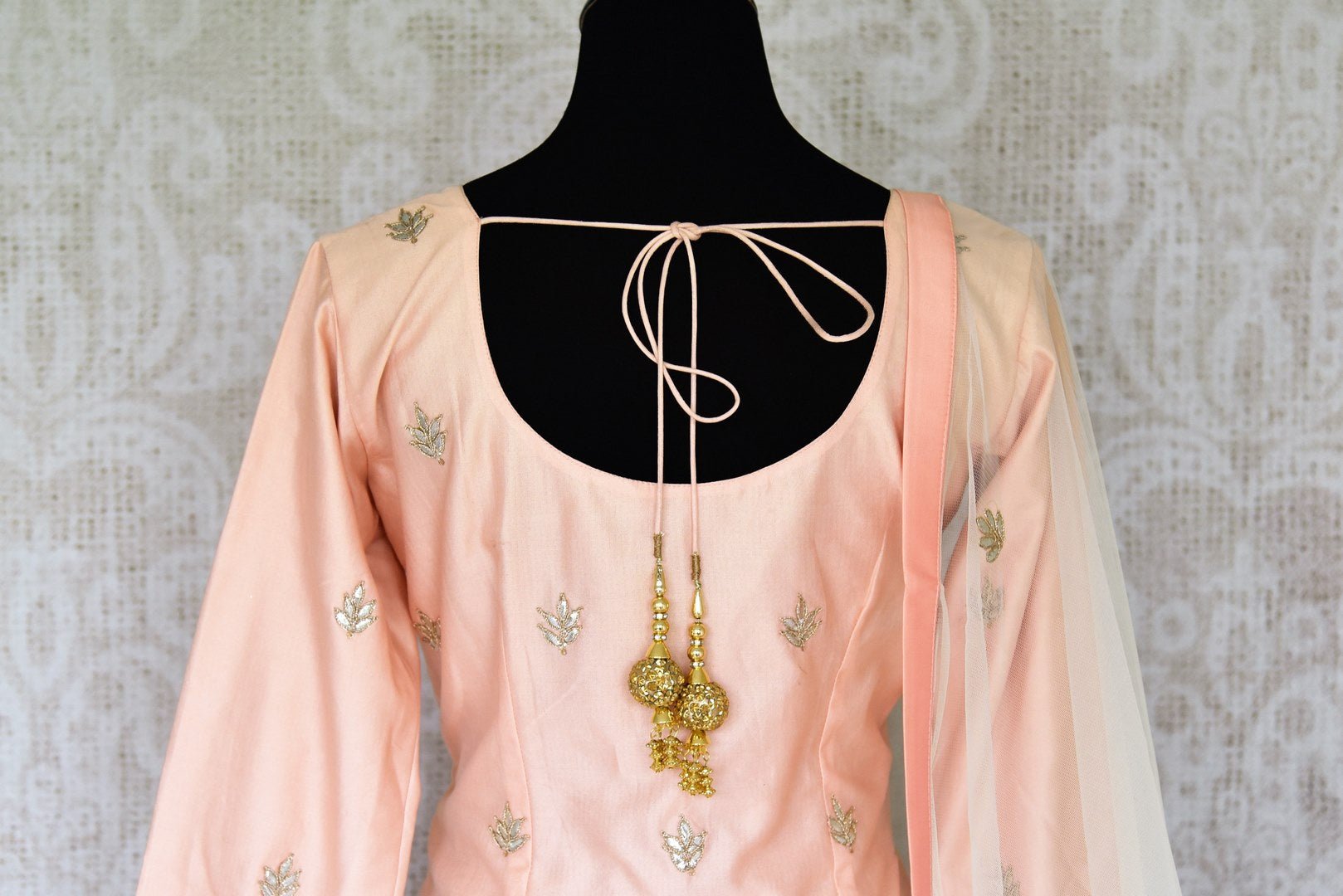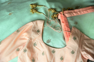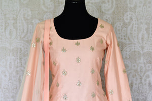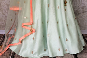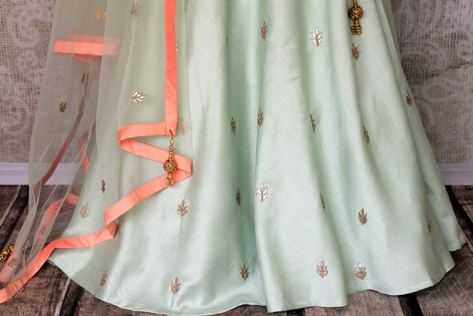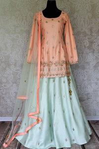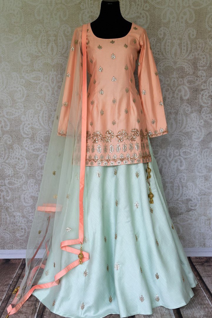 Embrace surreal charm with this mint green gota patti embroidered lehenga and a stunning peach full sleeves embroidered kurti. It comes with a gorgeous peach net dupatta to ooze elegance. Shop designer anarkali suits, lehenga sets, Indian dresses online or visit Pure Elegance store, USA.