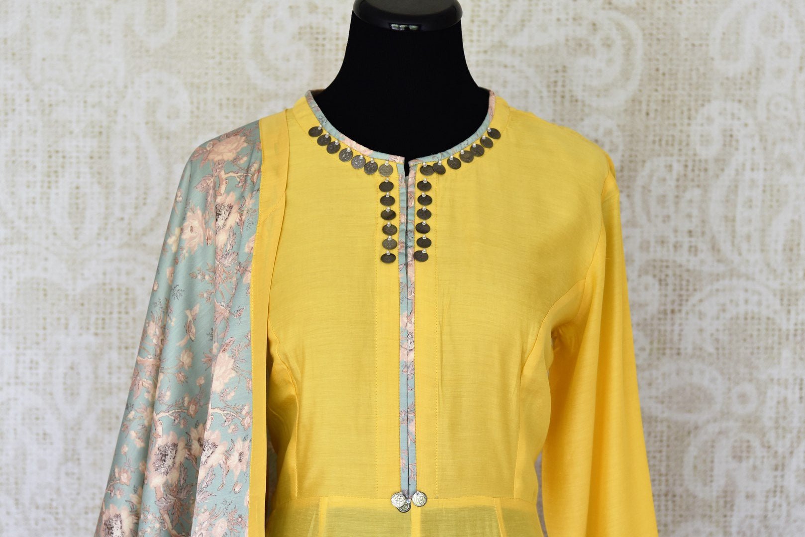 Rise and shine in this ethereal yellow silk straight long party wear kurti. Team the gorgeous full sleeves kurti with a pair of wide open trousers and drape a mint green floral dupatta. The color blocking and seamless design is perfect for special occasions. Shop Anarkali suits, lehenga sets, designer sarees online or visit Pure Elegance store, USA.