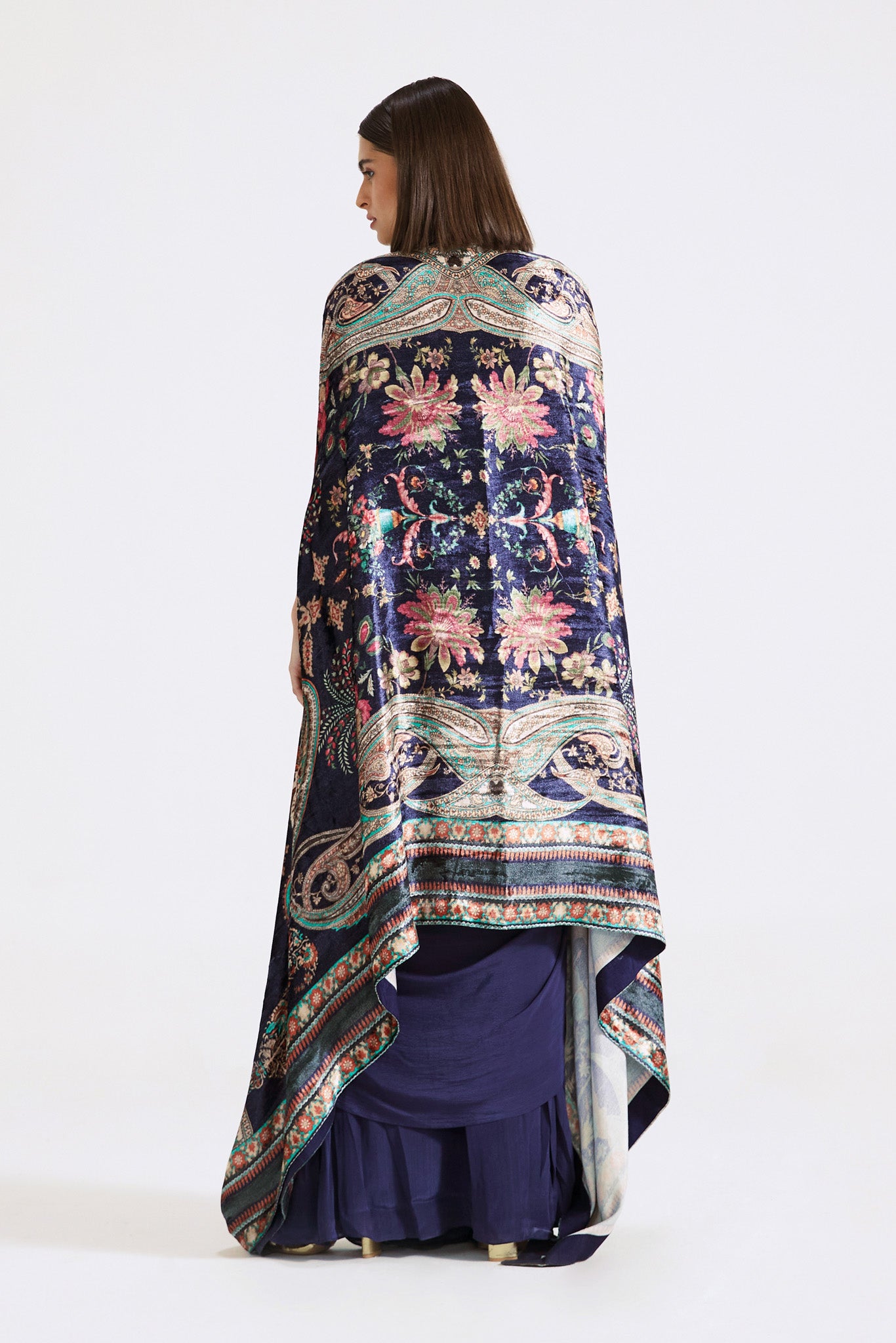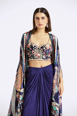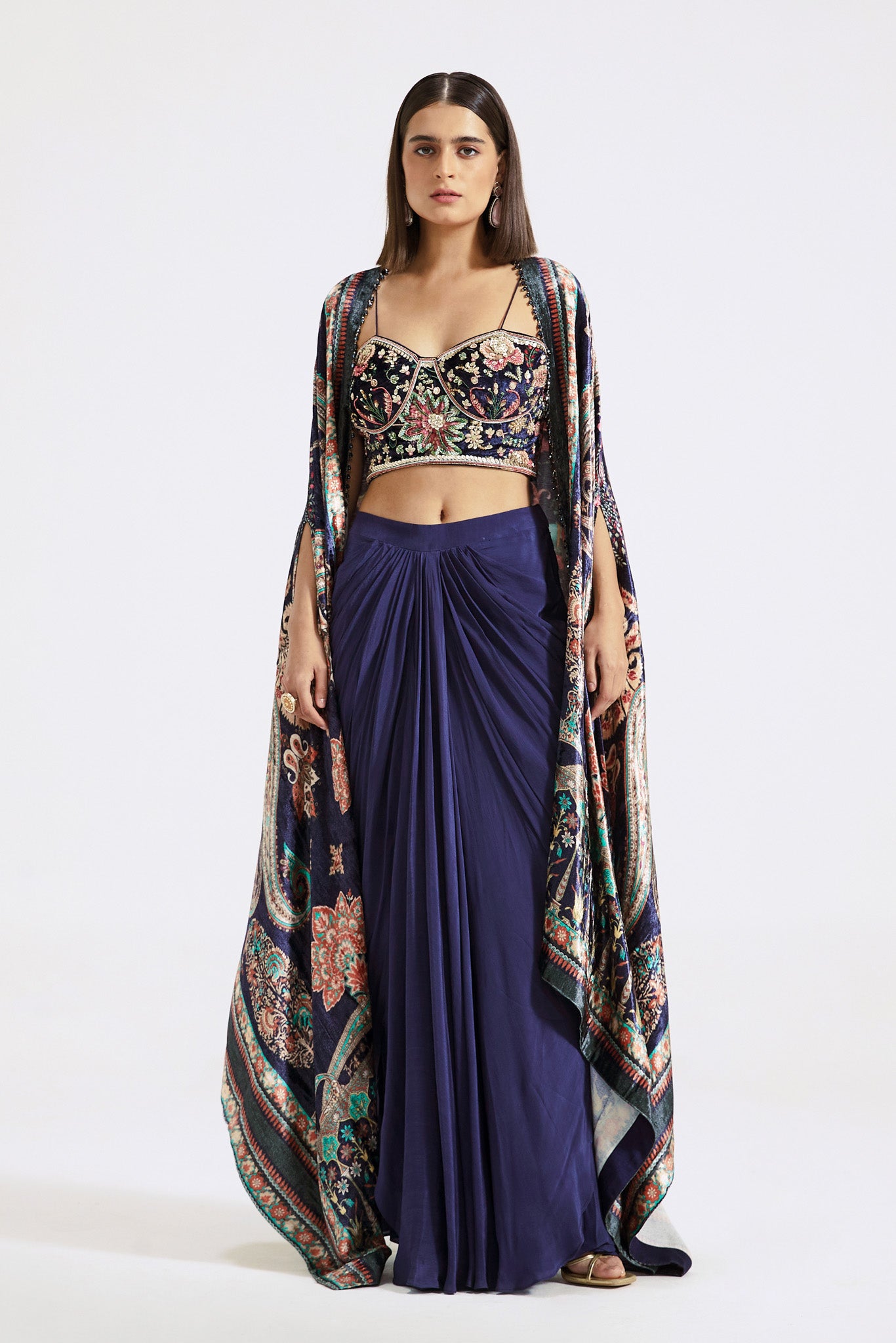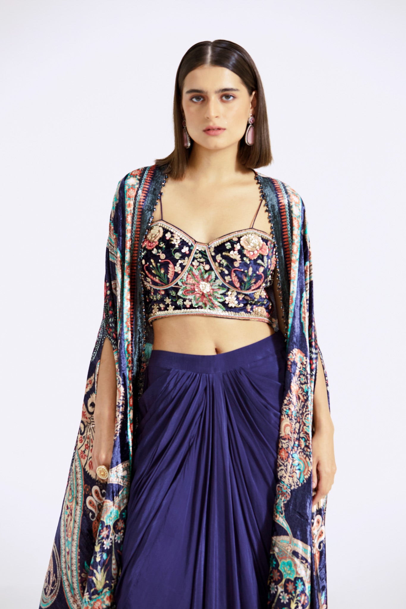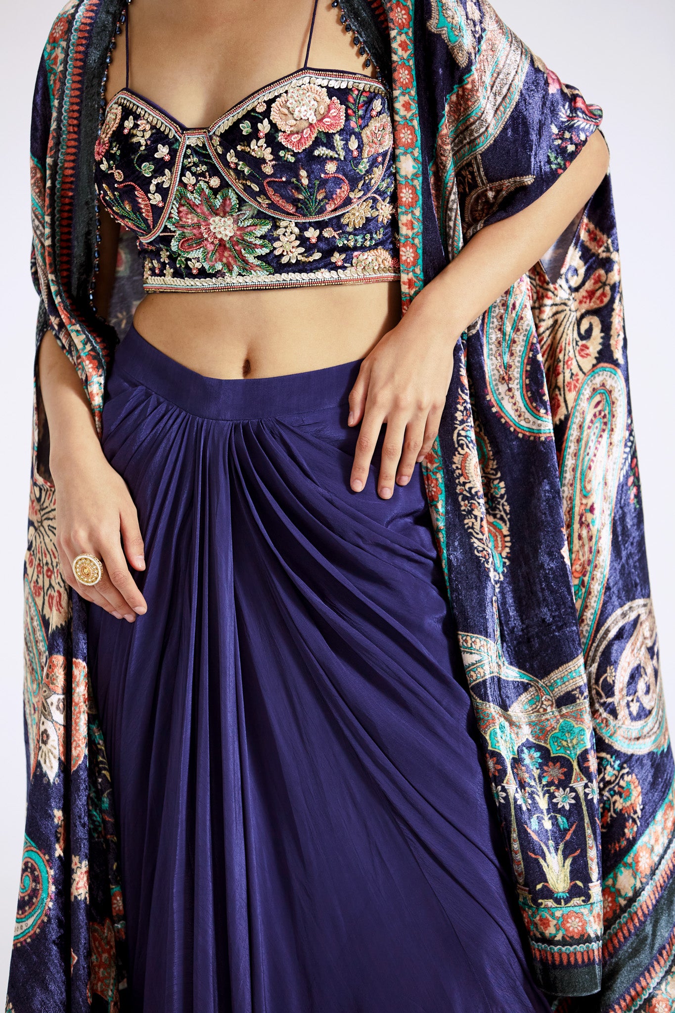 Exquisite blue velvet and crepe draped skirt set is perfect for weddings and festive occasions. It is crafted cutdana, sequin and comes with a printed cape. Shop online from Pure Elegance.