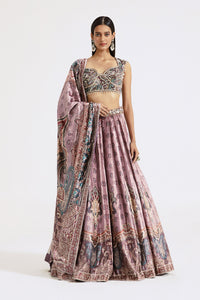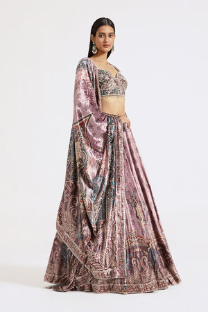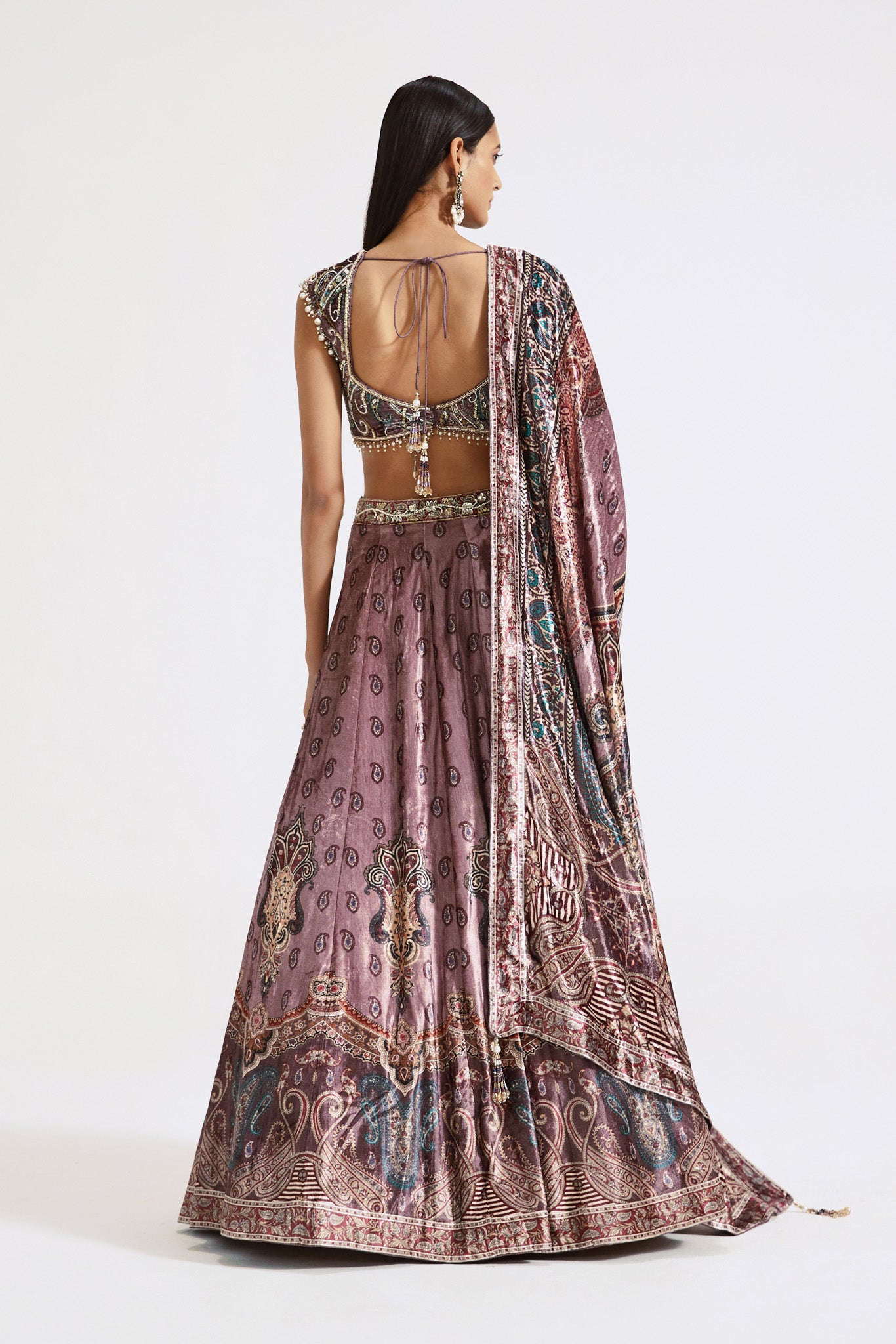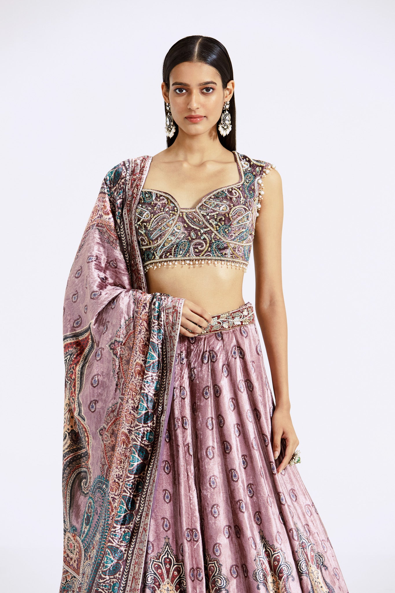 Exquisite onion pink printed and embellished velvet lehenga is perfect for weddings and festive occasions. It is crafted pearl cutdana, sequin and comes with a dupatta. Shop online from Pure Elegance.