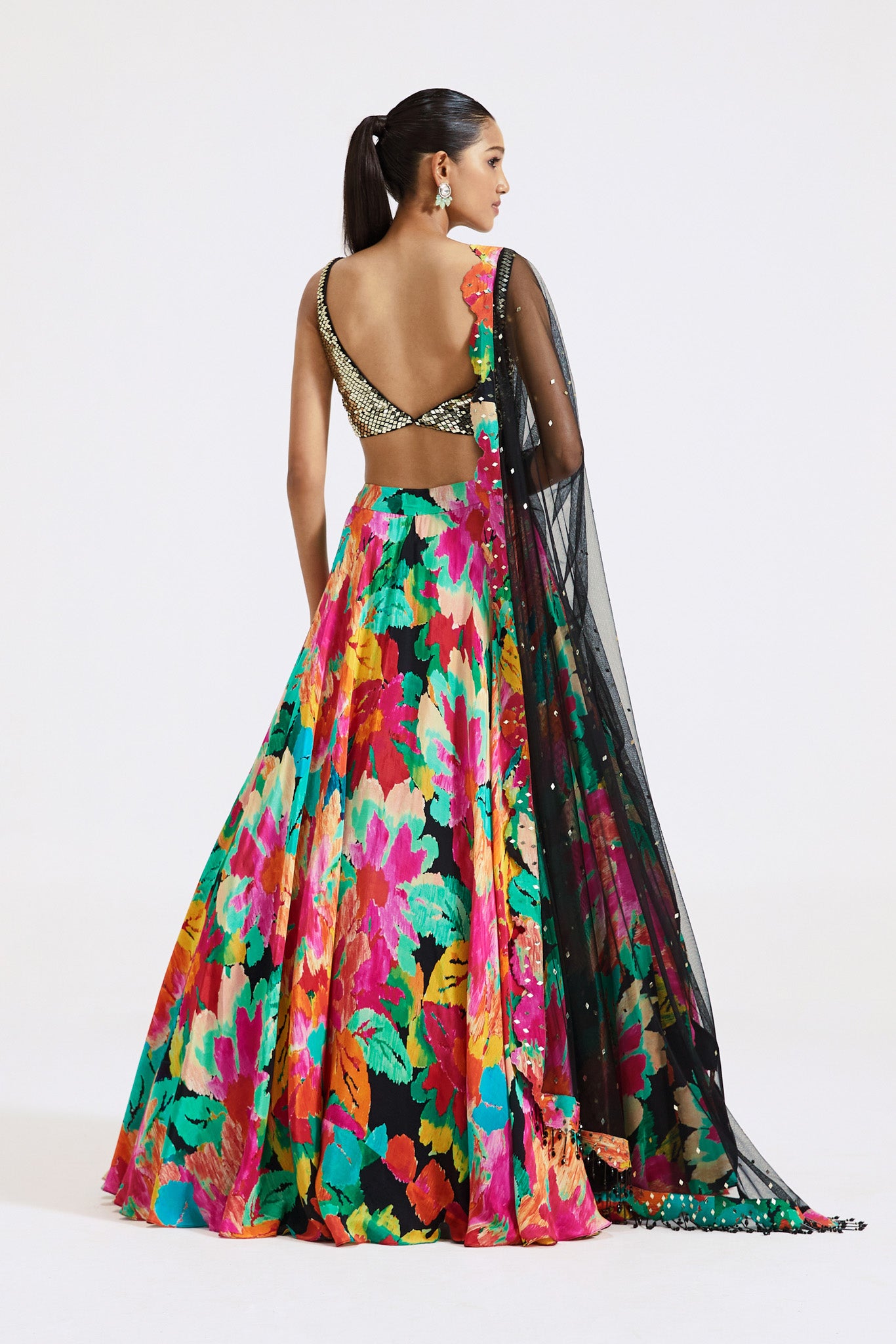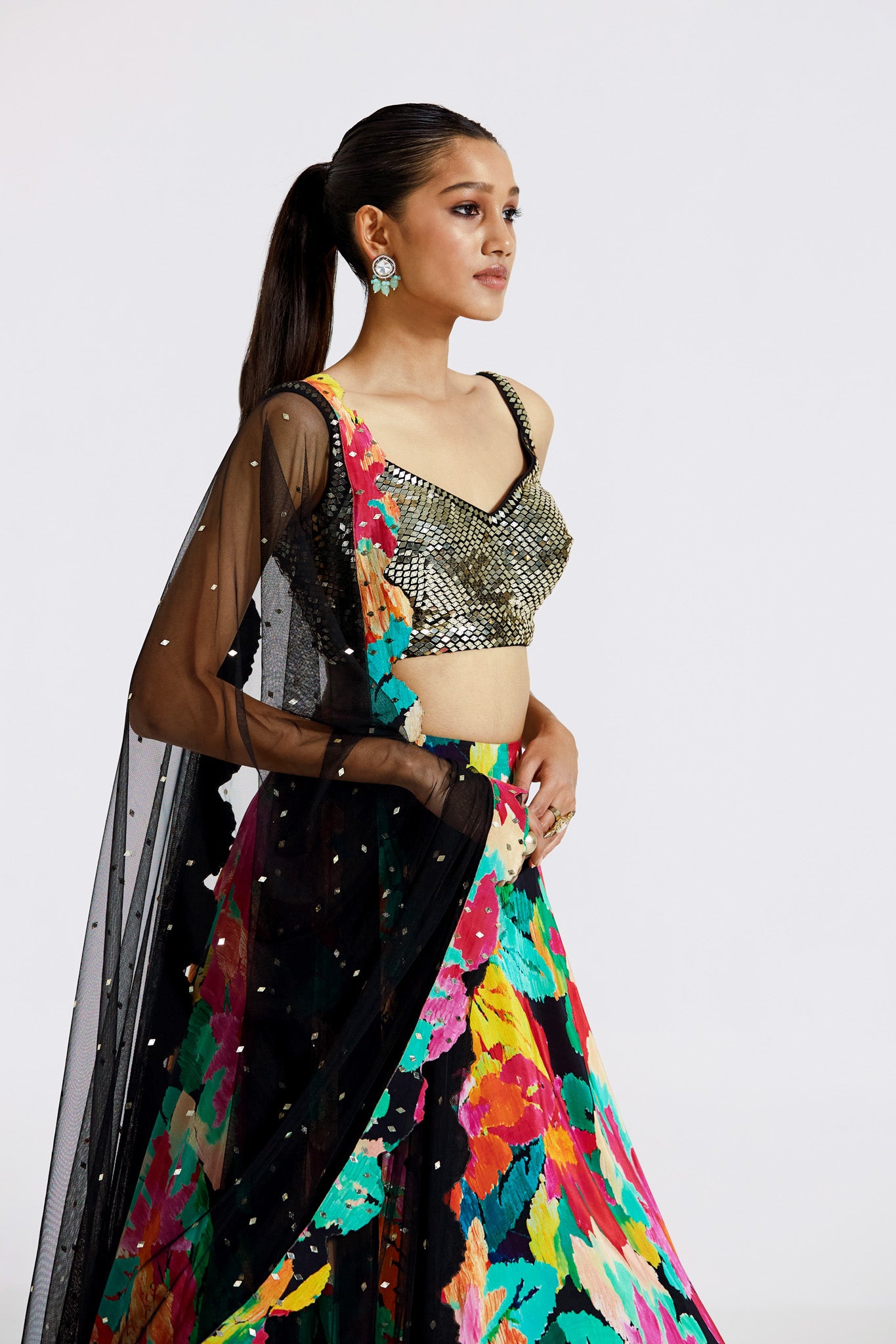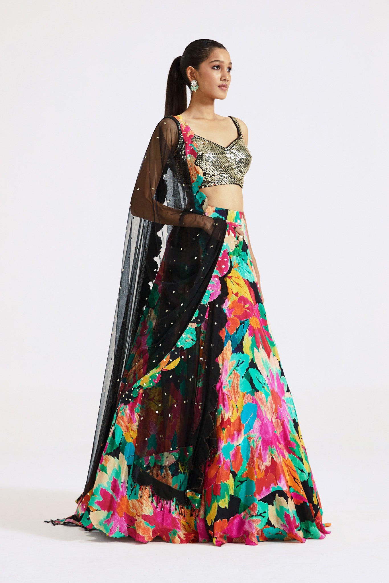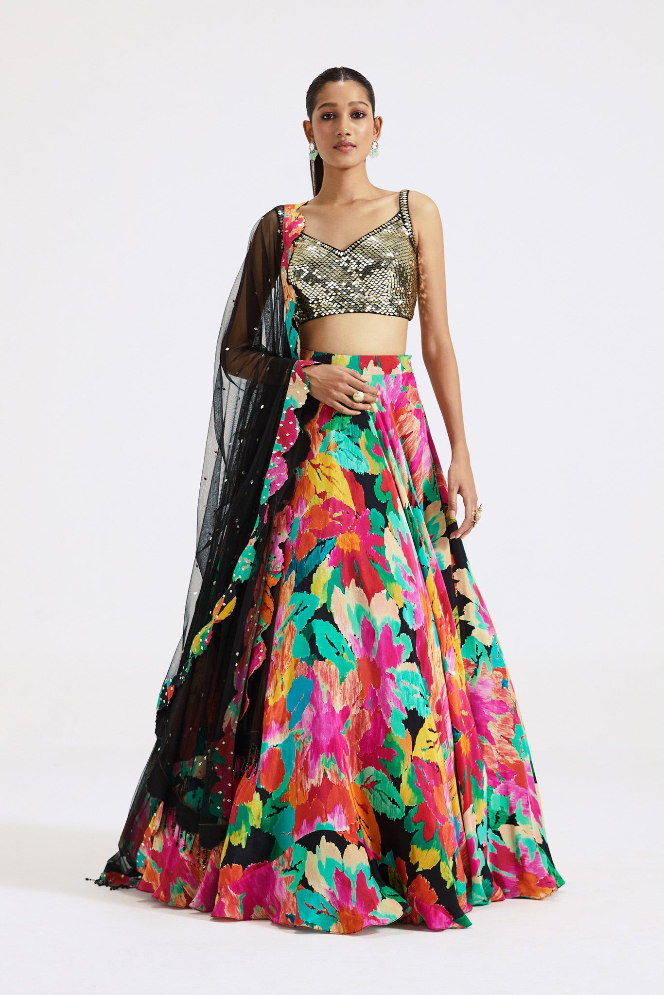 Stylish multicolor floral embroidered crepe contemporary lehenga. It comes with a matching dupatta. Shop online from Pure Elegance.