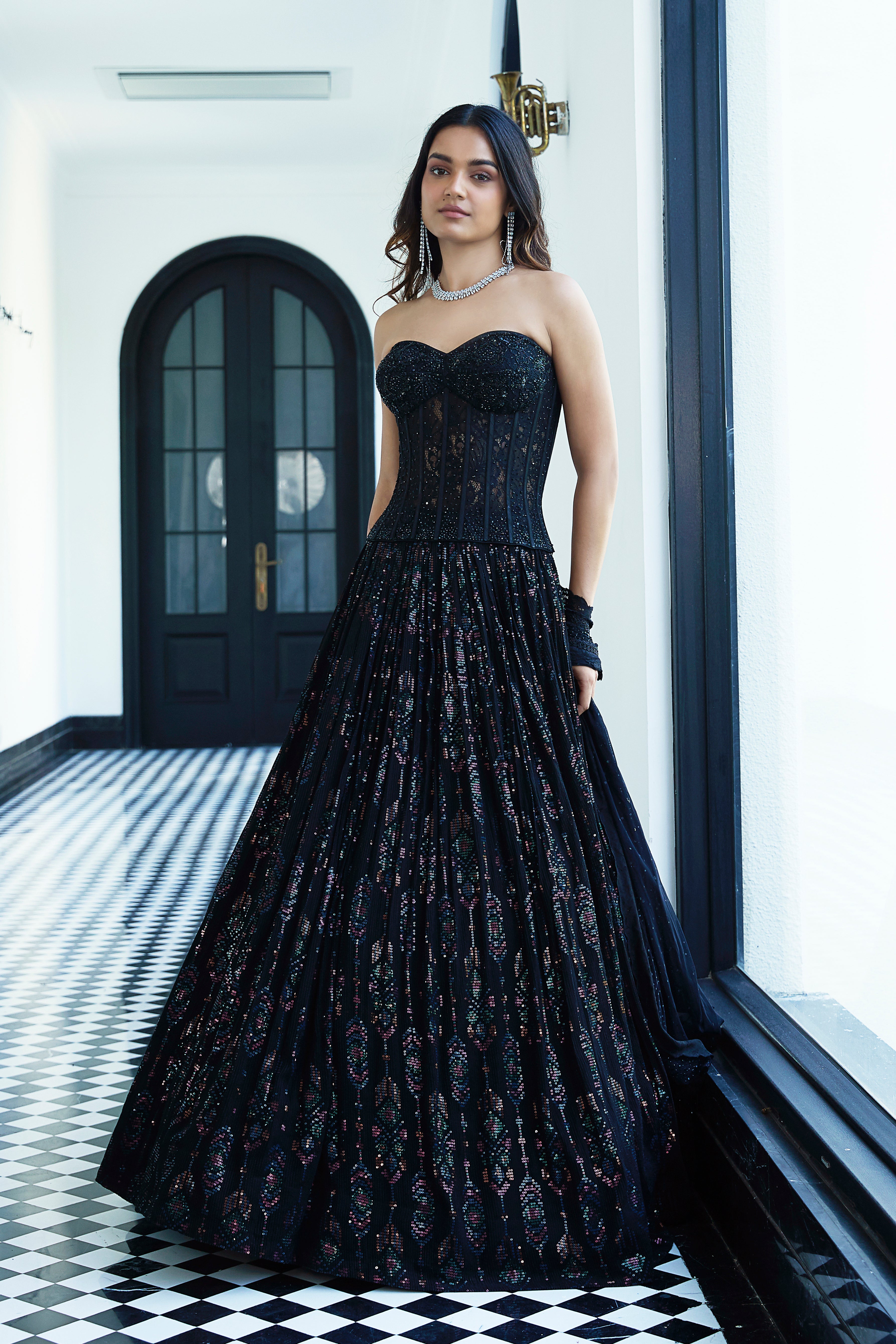 Alluring black embroidered chantilly net designer lehenga is perfect for wedding and wedding festivities. It comes with a dupatta. Shop online from Pure Elegance.