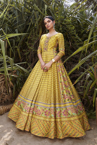 Exquisite yellow printed silk Anarkali dress is a perfect choice for day time weddings and festivities.