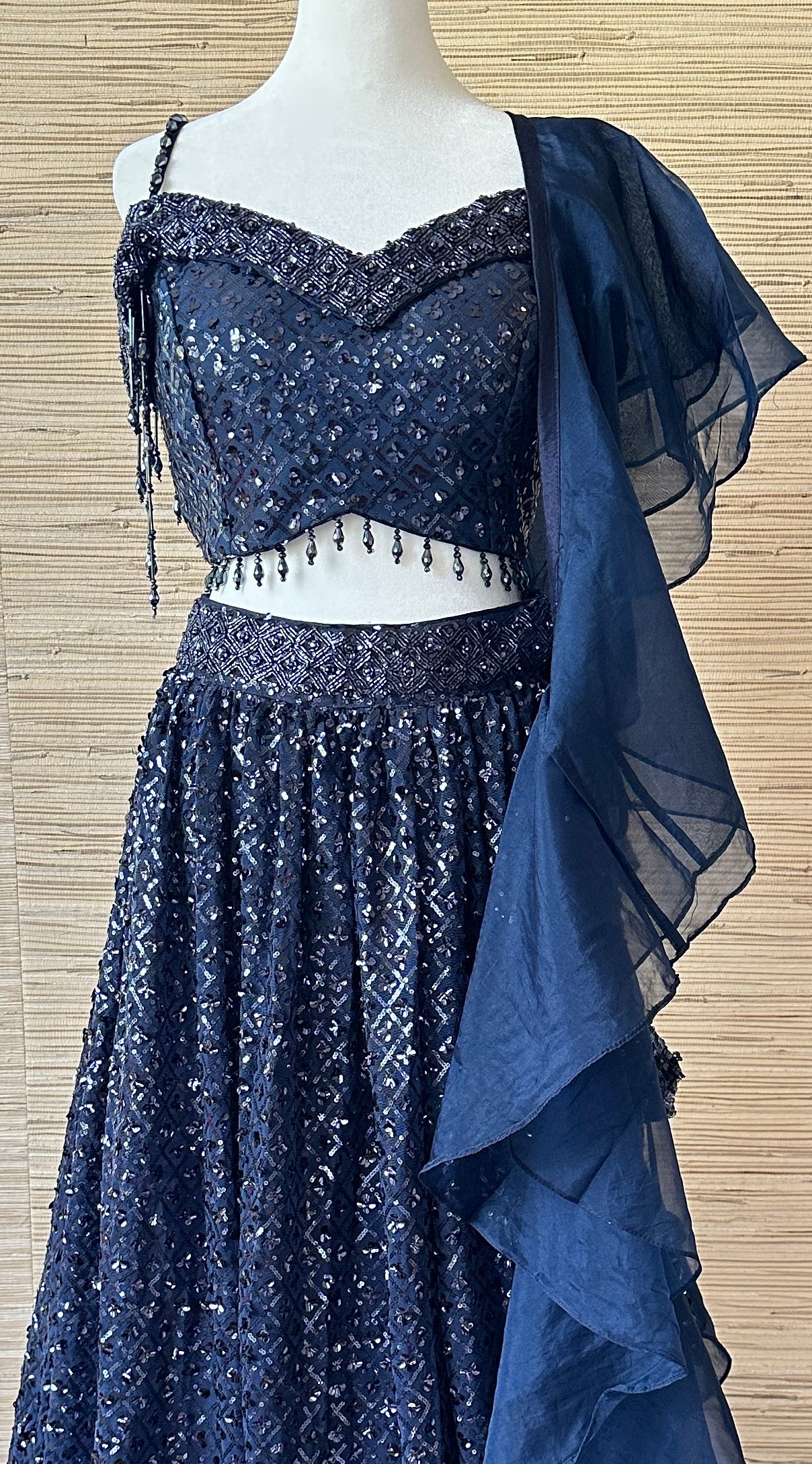 Beautiful navy blue embroidered designer lehenga with ruffle dupatta is perfect weddings and wedding occasions.