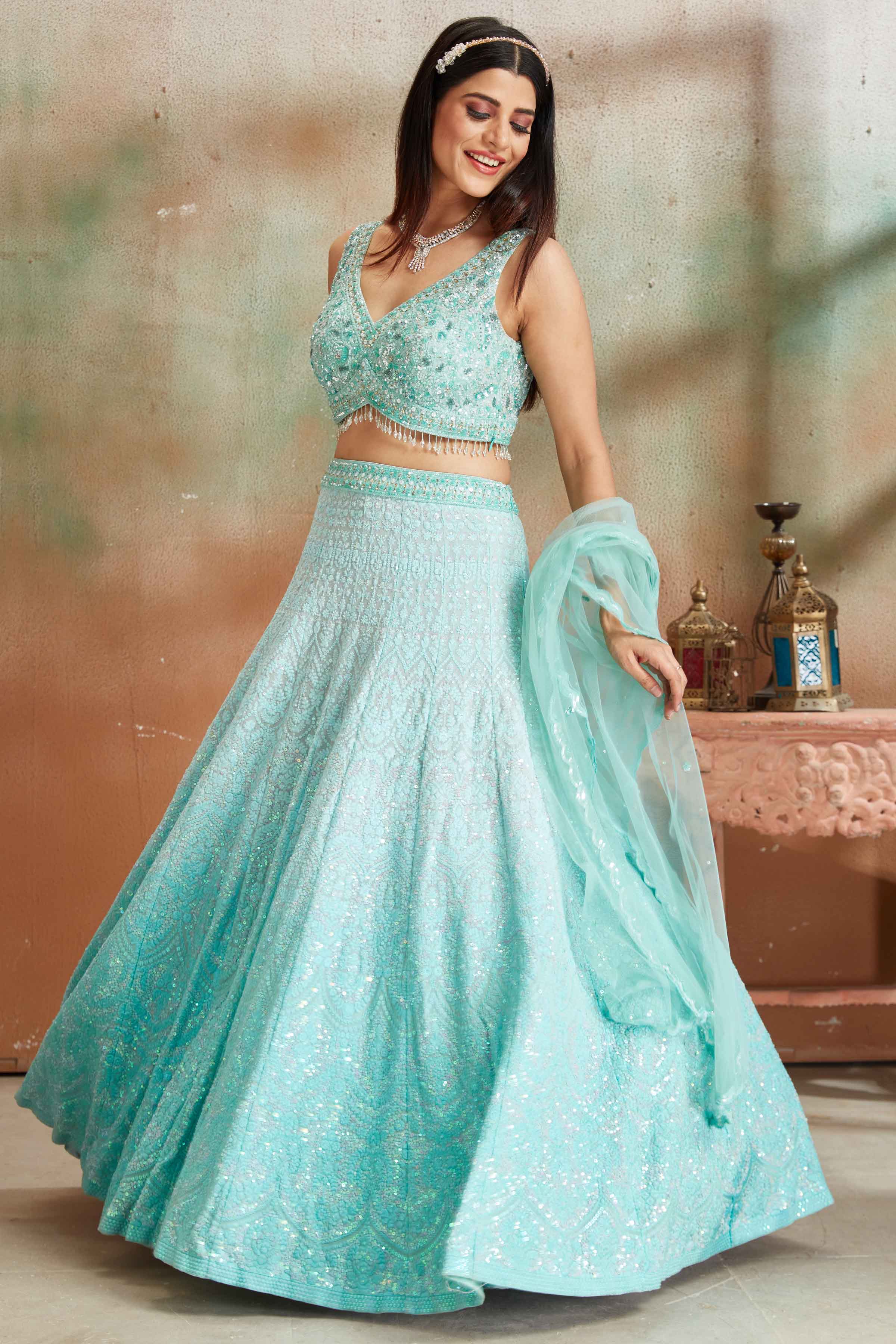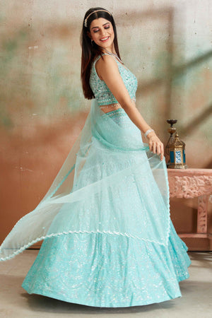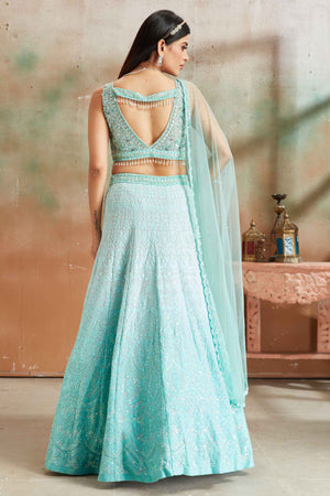 Go for a beautiful traditional look at weddings in this beautiful pastel blue Lucknowi georgette lehenga. The lehenga comes with a beautiful dupatta.
