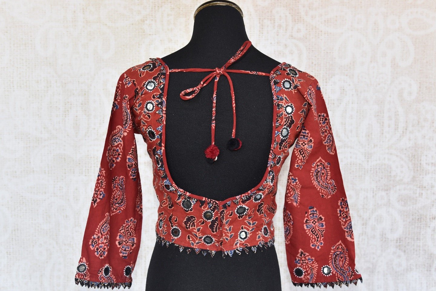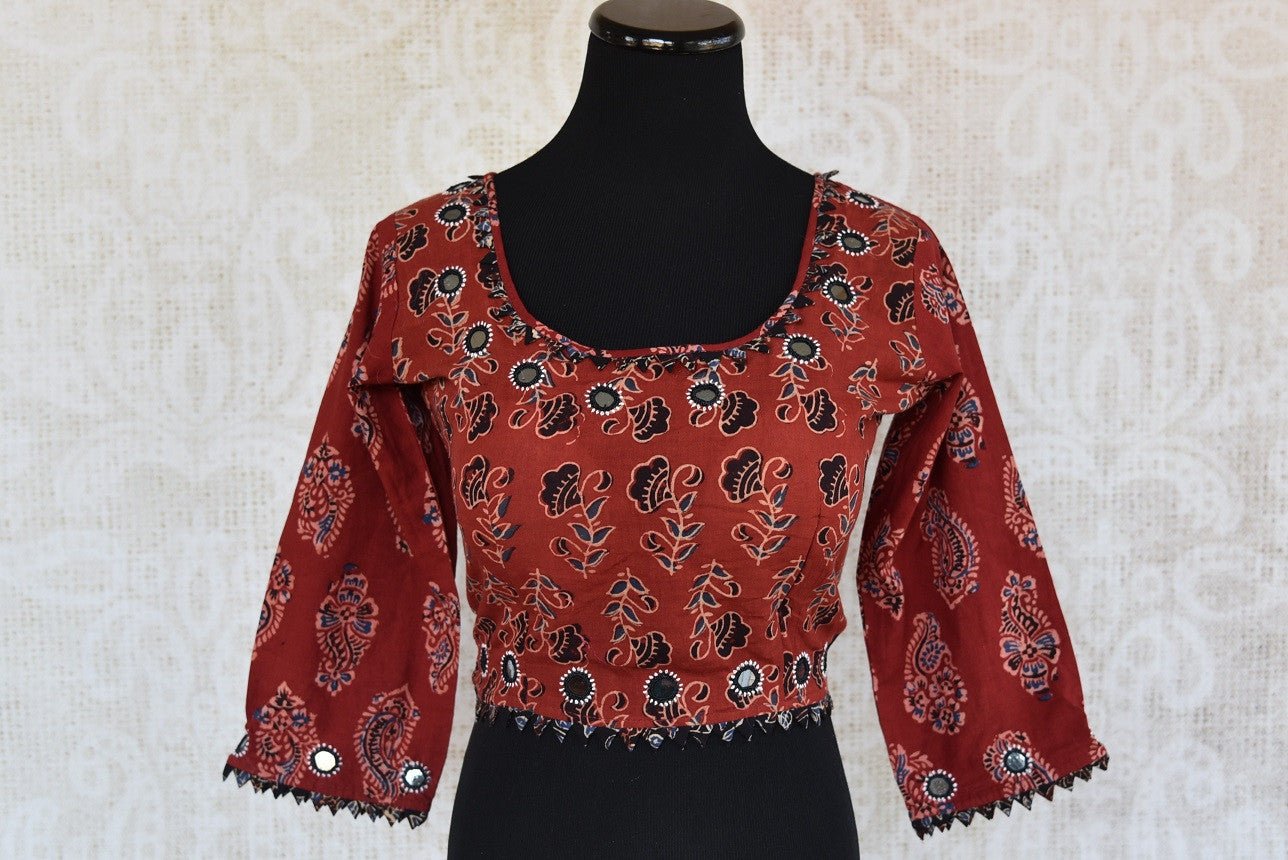 The deep maroon long-sleeved cotton blouse has a deep neck adding a sexy look to any saree that it is worn with. It has a beautiful ajrakh print. Sizes Available 34/36/38/40.