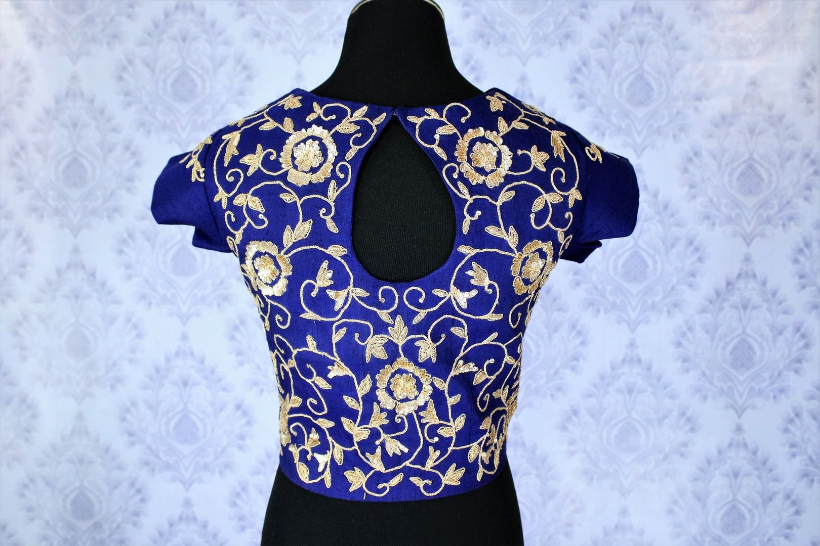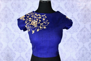 Elevate your plain sari with a touch of uber-glam infused royal blue raw silk embroidered designer blouse. It can be doubled up as a gorgeous crop top for maxi skirts and palazzo pants. The floral zari embroidery on the back side of the blouse is absolutely stunning. The keyhole on the back exudes a feminine touch.