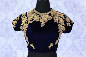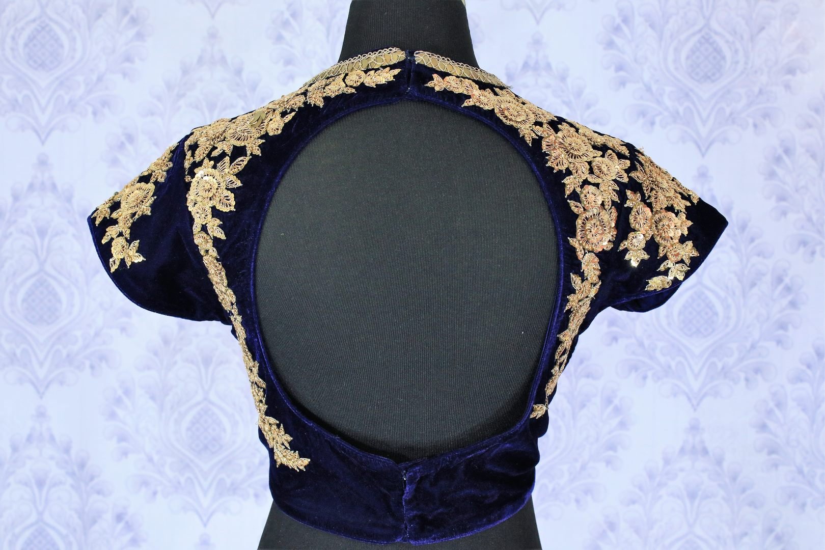 Embrace the beauty of celebrity-inspired royal blue velvet embroidered blouse with intricate detailing. The floral embroidered velvet blouse has a deep oval back that will totally leave everyone in awe. Strike a lasting impression in this designer blouse, shop online or visit Pure Elegance store in USA.