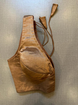 Elegant copper tissue sleeveless saree blouse. Shop designer blouses from Pure Elegance in USA.