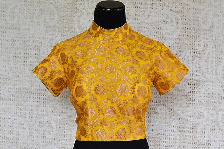 Yellow and gold designer pre stitched blouse. Pair this modern blouse with any lahenga, saree.