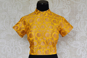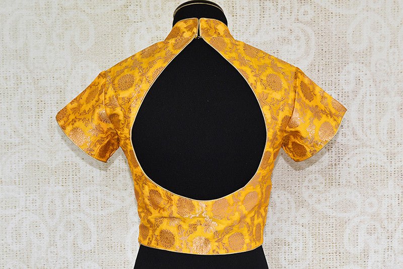 402229 Yellow And Gold Banarasi Silk Blouse With Open Back