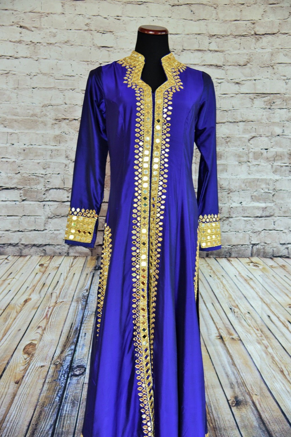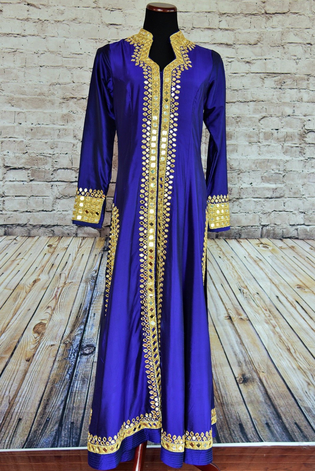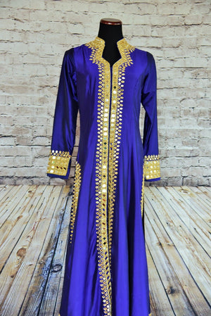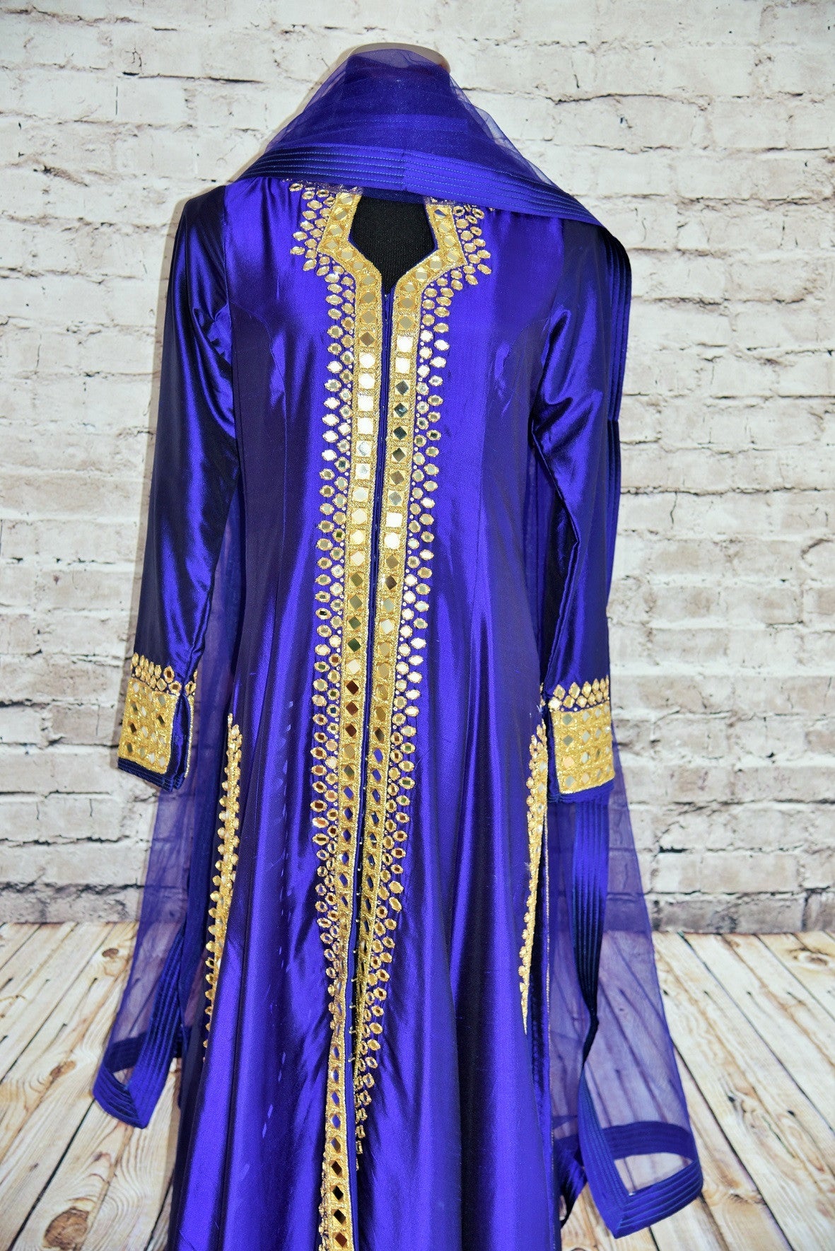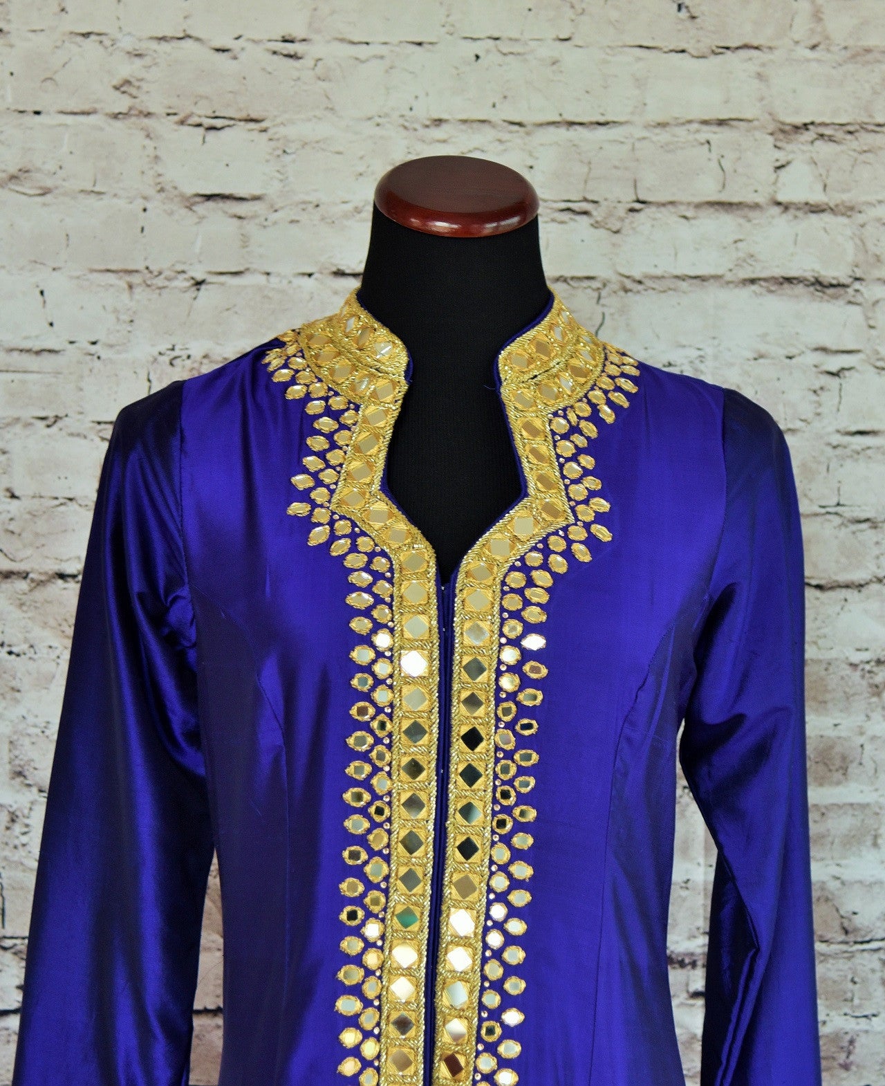 A long sleeve royal blue suit with a high neckline. The gold and mirror embroidery around the high neckline, sleeves, and slit gives the suit an elegant look. Accompanied by a sheer royal blue dupatta and churidar.