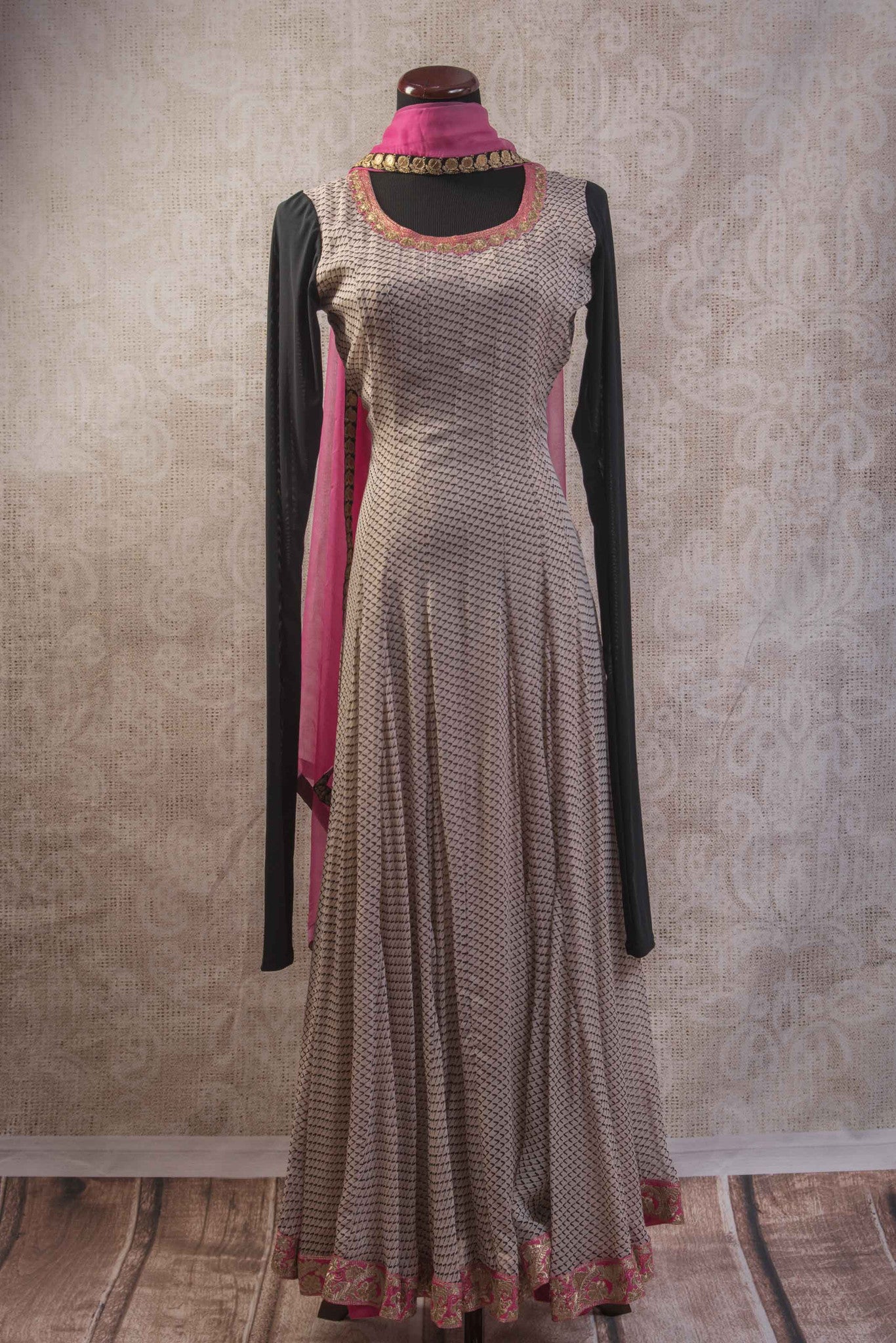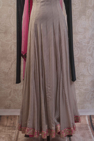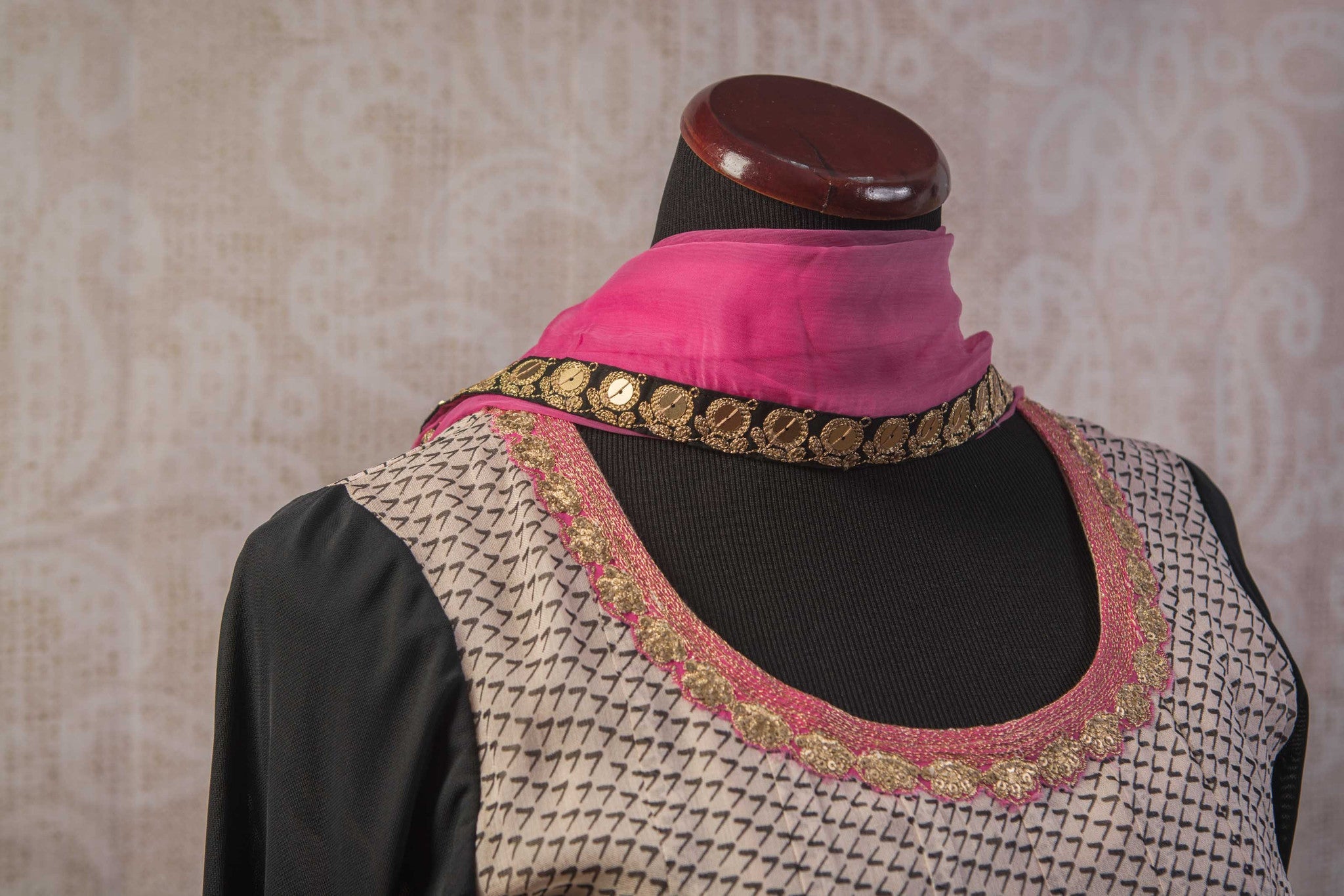 Off white and black patterned suit is soft and feminine with long flowing sleeves and pleats down the skirt. Both collar and skirt hem are decorated with pink and gold embroidery. Sheer pink scarf has gold embroidery and sequin.