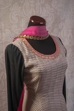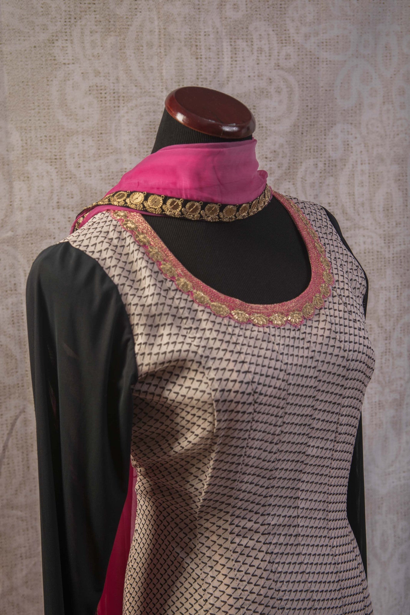 500948 Suit Long Sleeve Off-white & Black with Gold Embroidery, Sequin and Pink Scarf