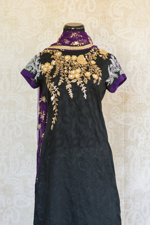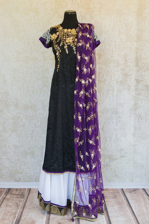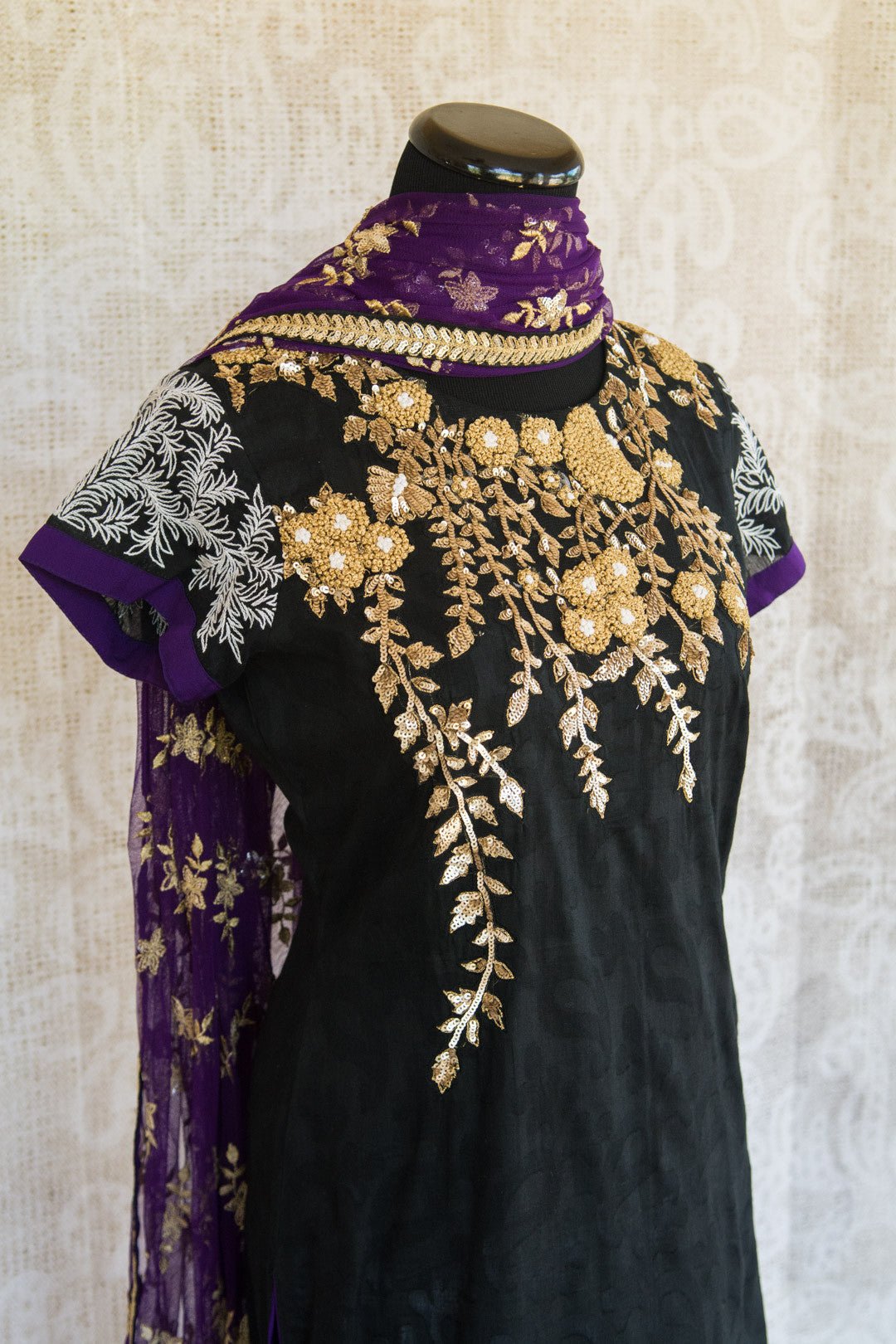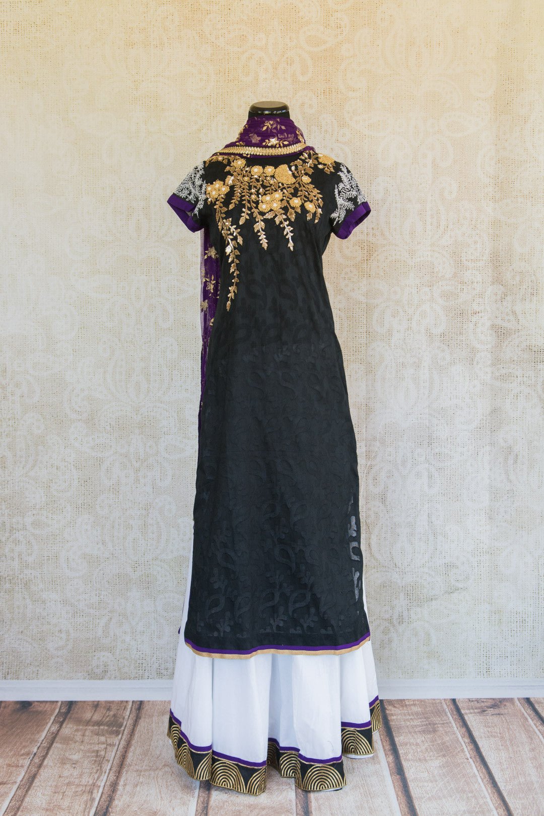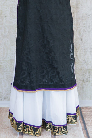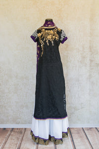 Black sheer paisley fabric boasts an elaborate gold embroidered bodice. Purple short sleeves are embellished with silver embroidery. White skirt shows playful purple hem with gold circles. Sheer purple scarf with gold hem and extensive gold and silver floral embroidery.