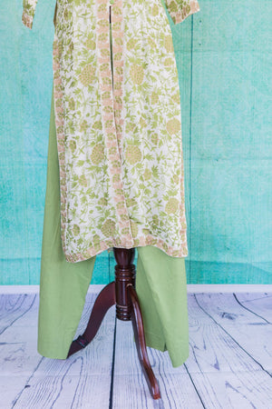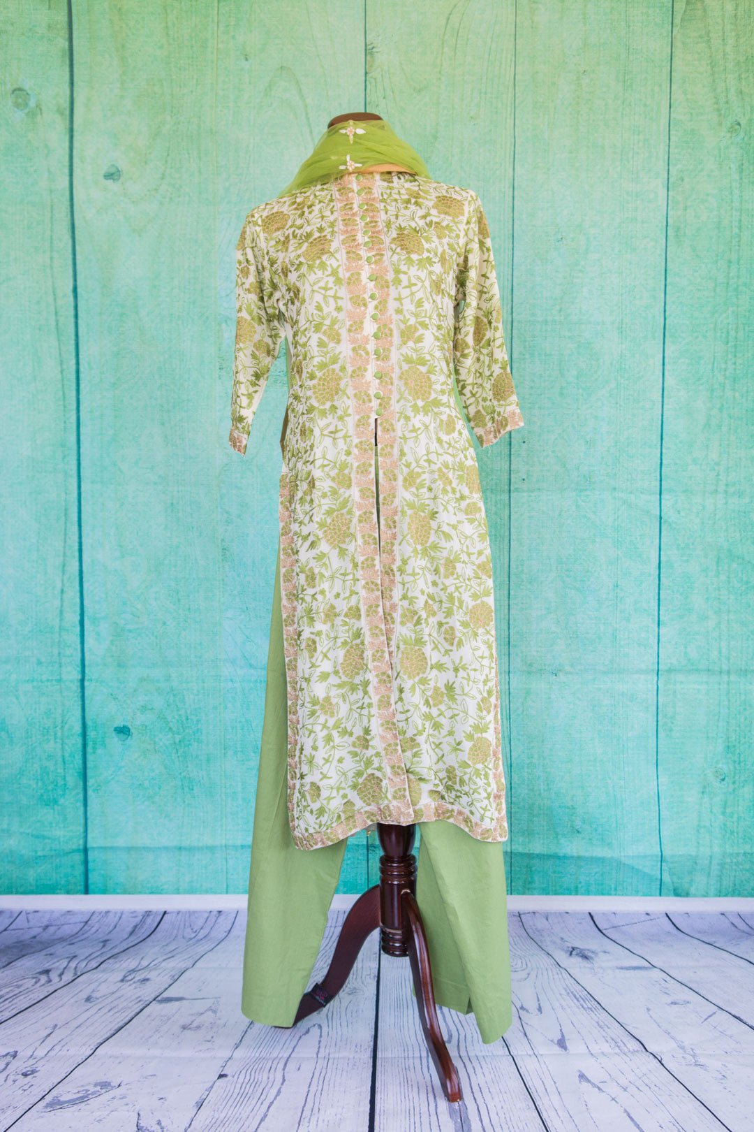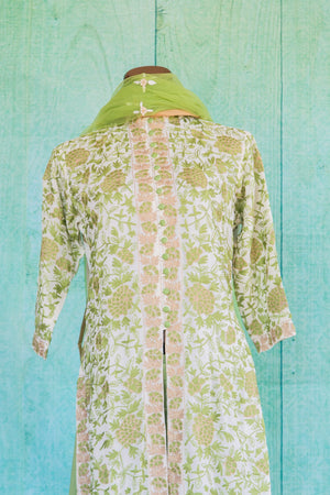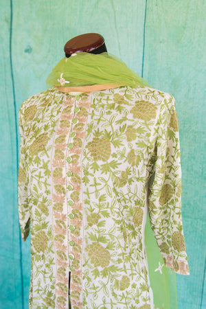 Green and peach floral pattern on white suit with long sleeves. Bodice has embroidery and buttons from neck to waist where there is a split down the front. Sheer green scarf has hand embroidered floral accents.