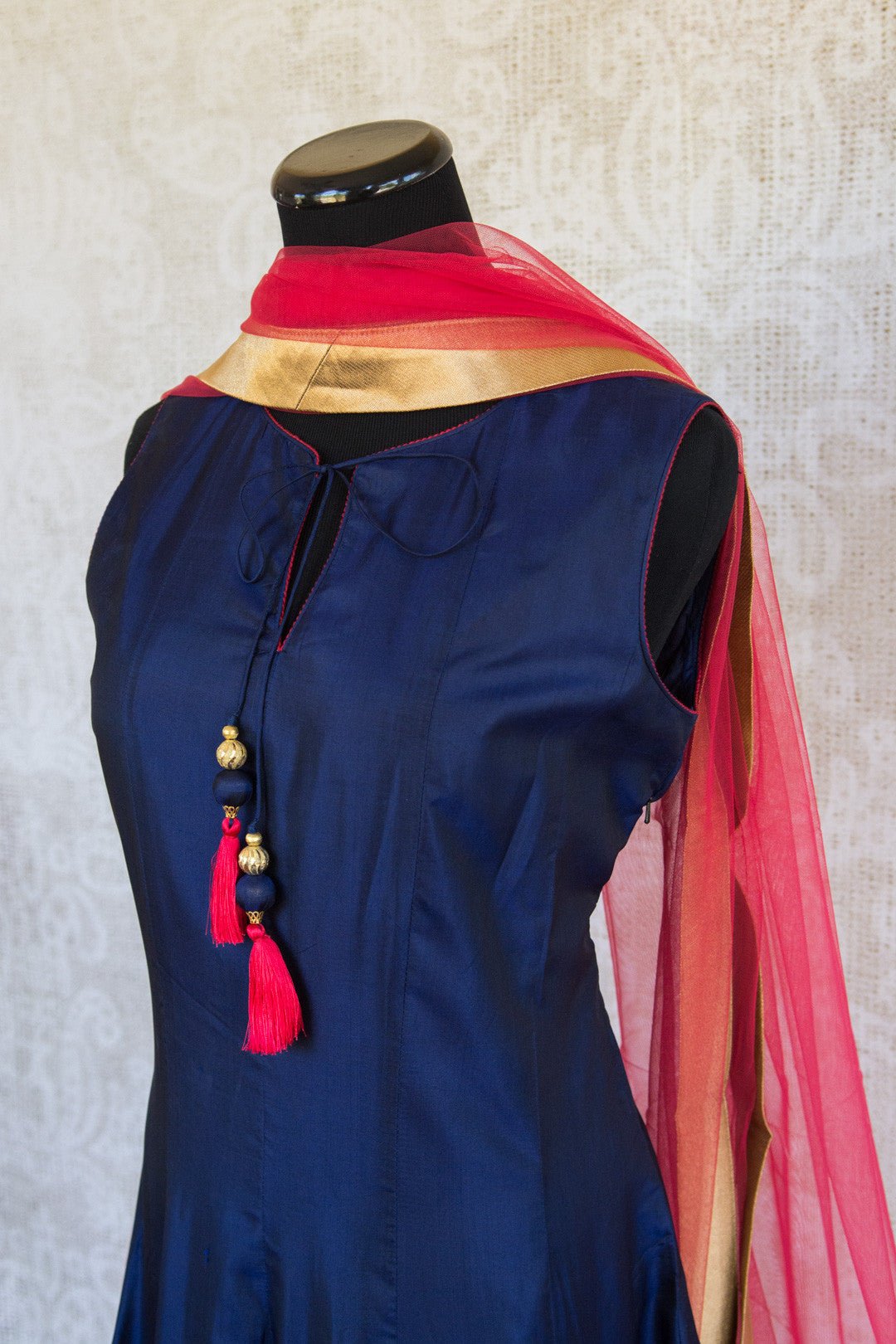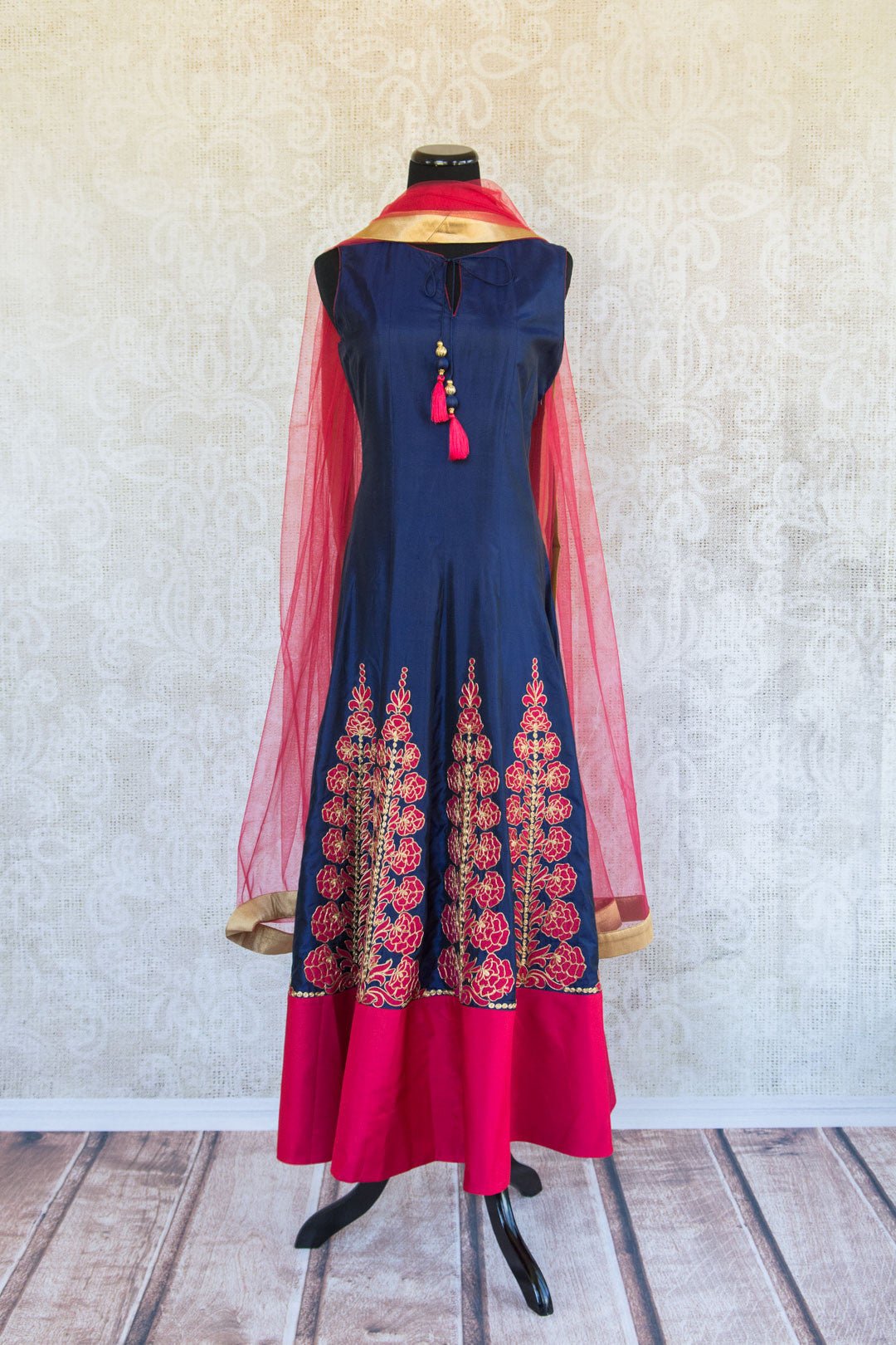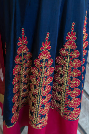 Sleveless blue and fuchsia suit with tassled neck tie and sheer scarf. Skirt has lovely embroidered floral pattern with gold accent and wide fuchsia hem.