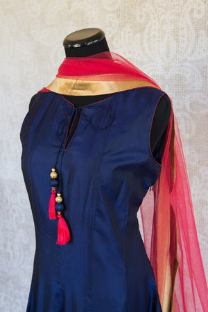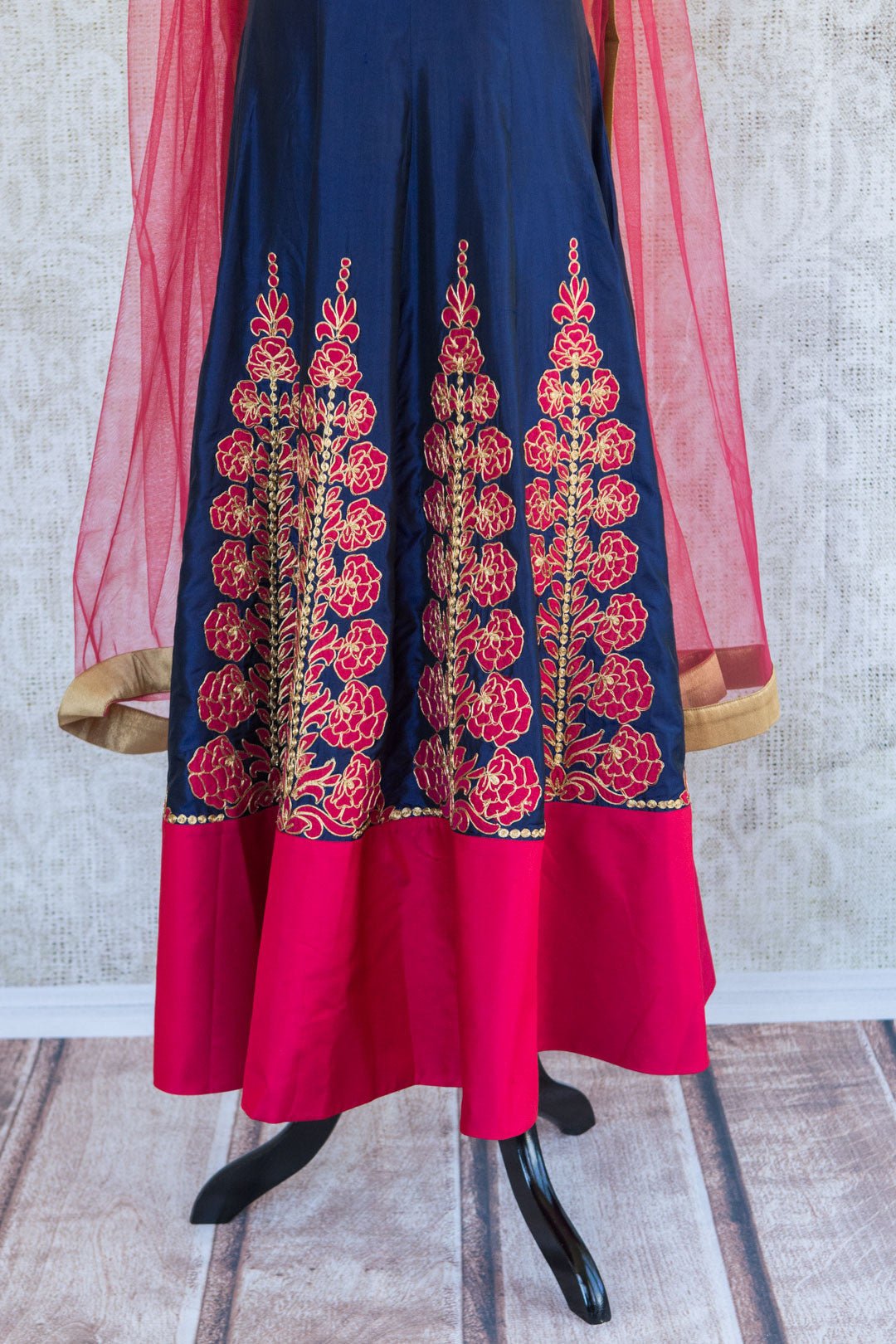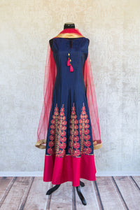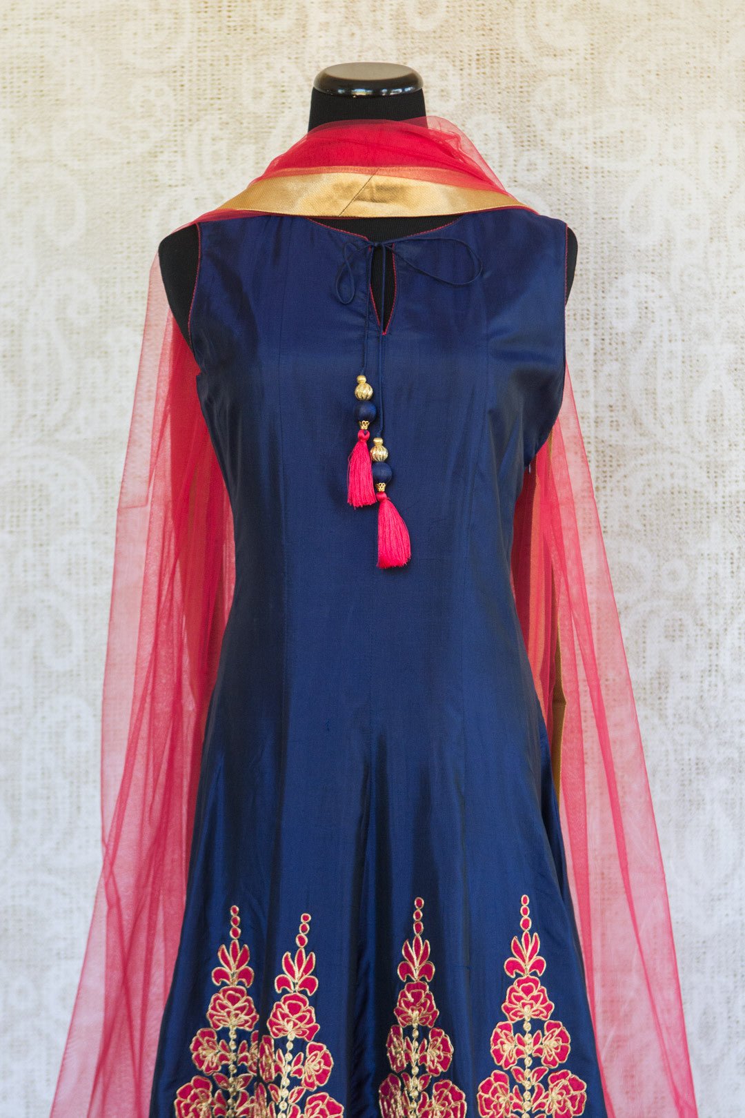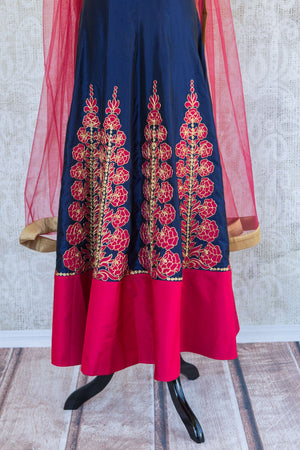 501086 Suit Sleeveless Blue with Fuchsia and Gold Floral Embroidery and Scarf