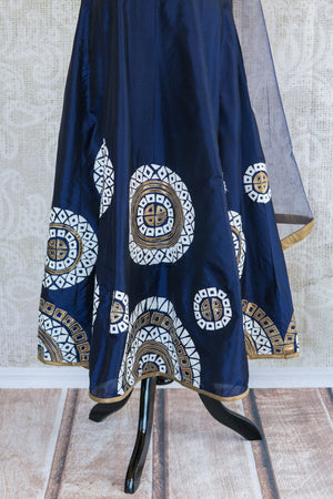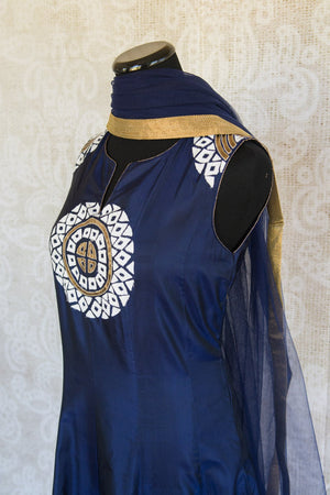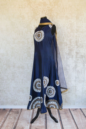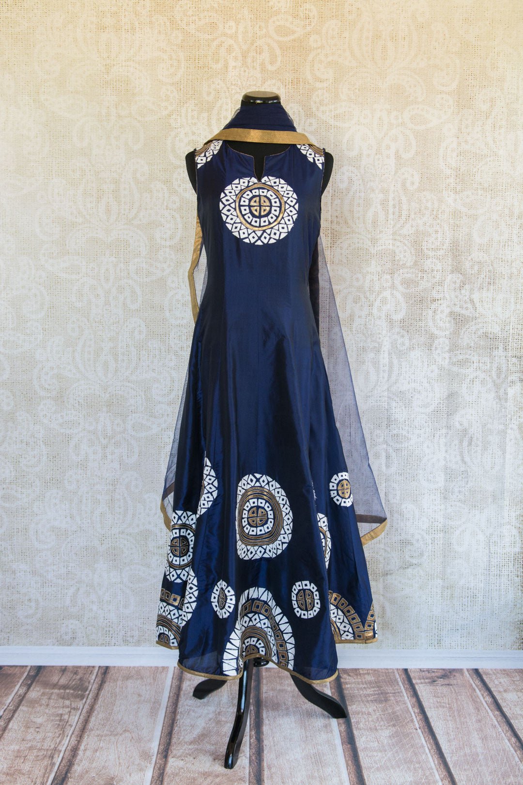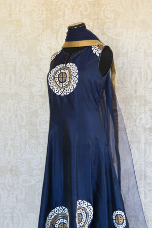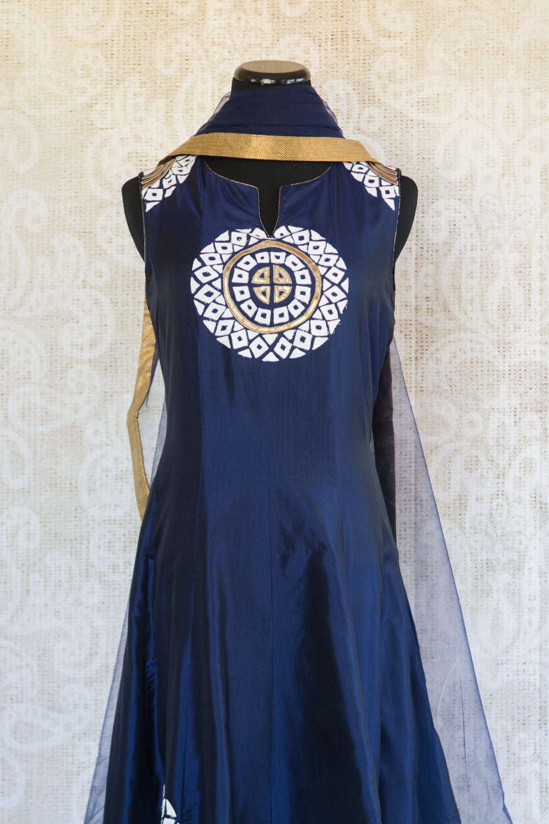 Dark blue sleeveless suit with large and small white and gold embroidered circles. Sheer scarf with gold trim completes this outfit.