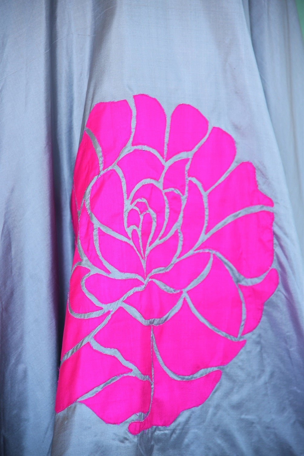A subtle grey that's bound to stand out in a sea of bright colors with a pop of floral pink patch work. The sleeveless, floor length anarkali is gorgeous and unique, in every bit of sense and style.