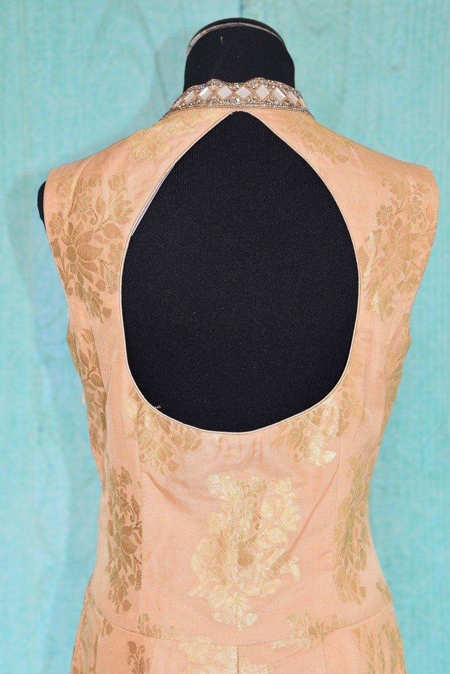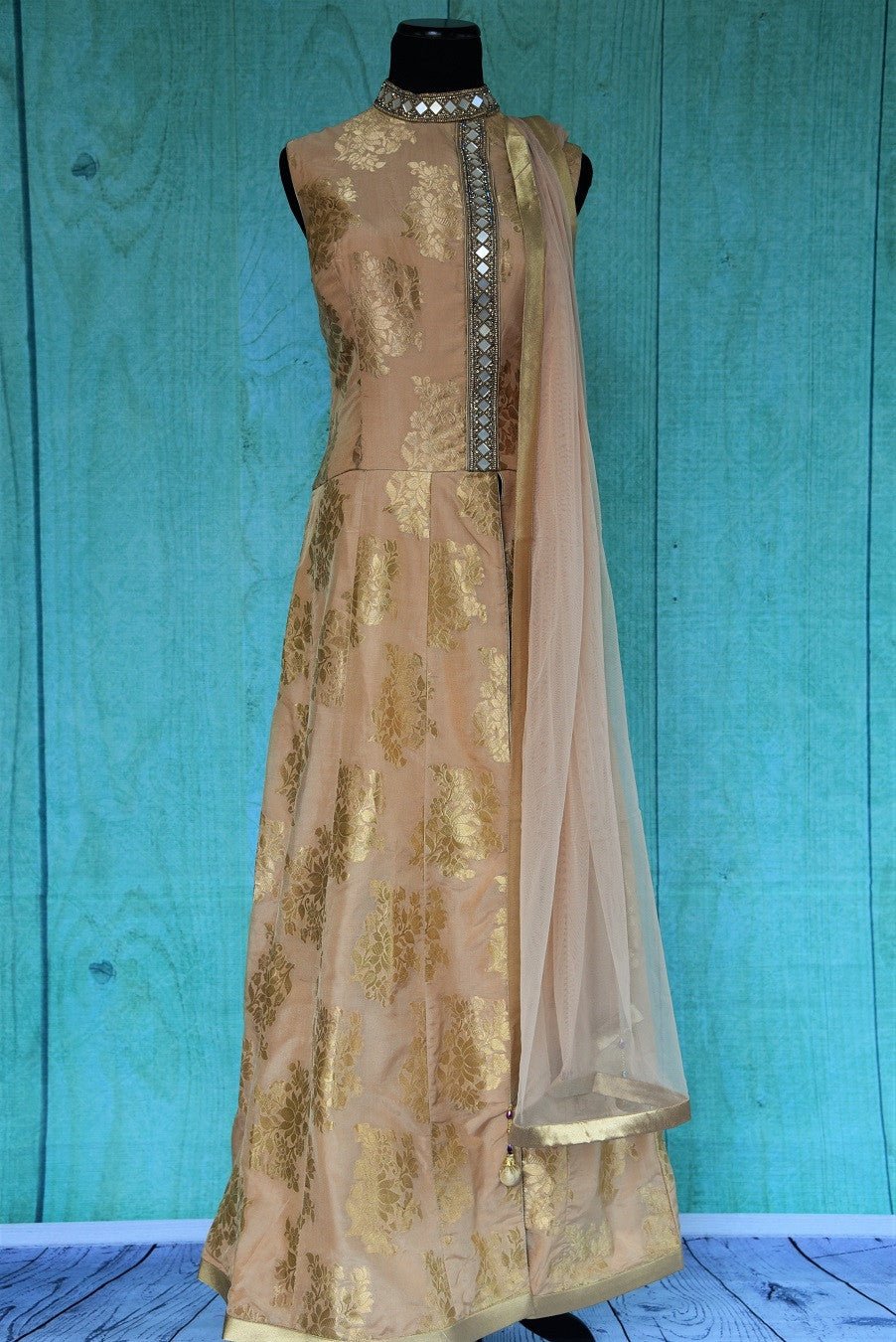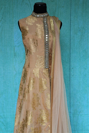 This floor length anarkali is keeping things simple, elegant and absolutely charming. The beige has a hint of rose gold and the gold work is subtle, yet very much there. This Benarasi anarkali will easily be one of the most versatile pieces in your wardrobe.