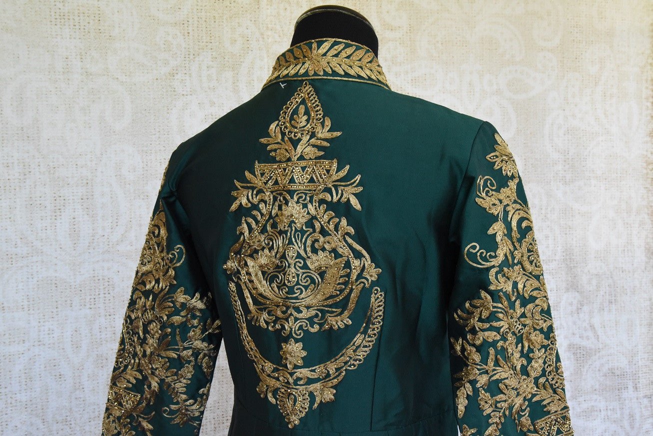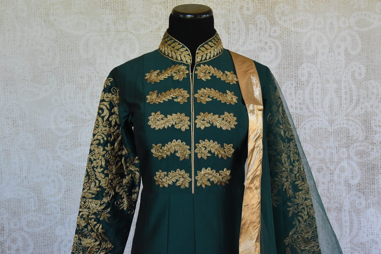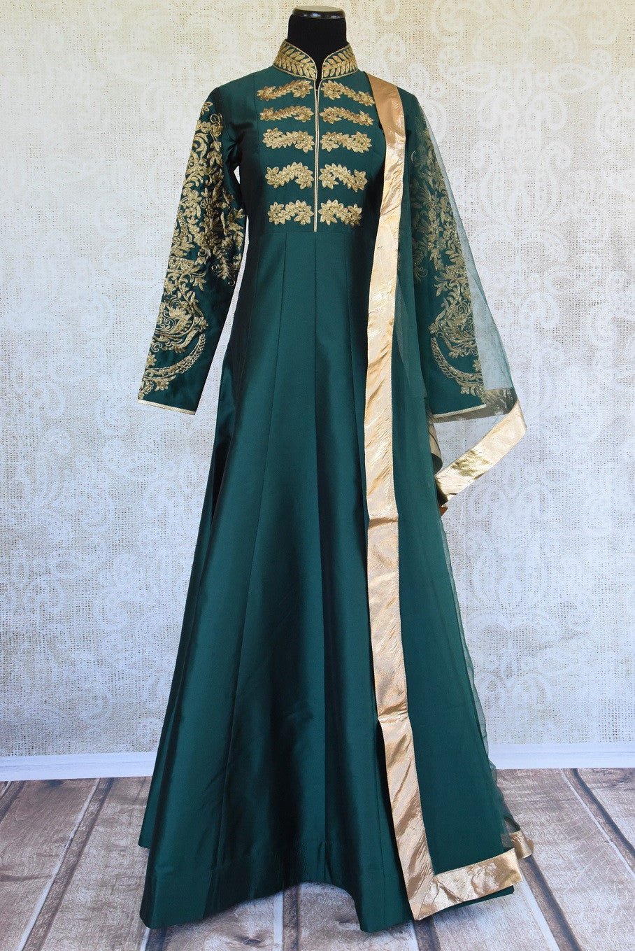 Feel like royalty in this majestic green floor length anarkali and get ready to have all eyes set on you. The gold zandori work is classic and every big elegant, giving this green ethnic outfit a lovely touch of sparkle.