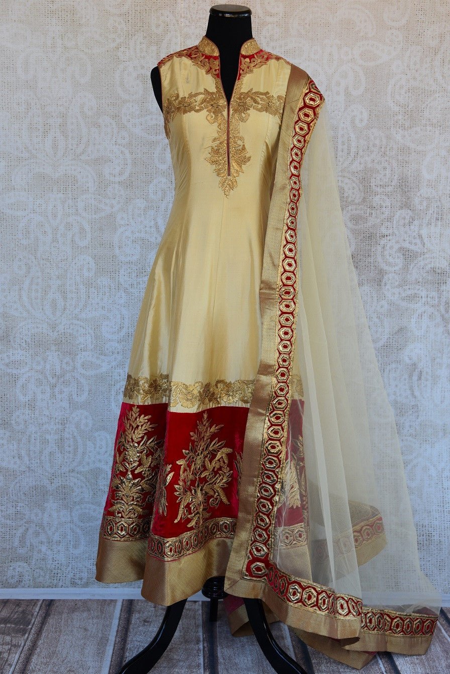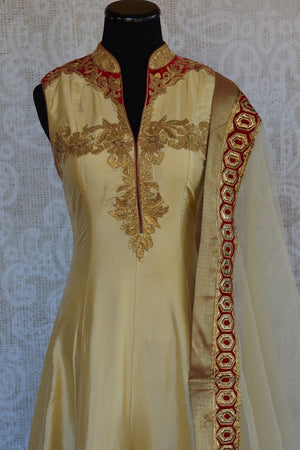 The gorgeous cream silk salwar suit has red and golden work on it. The high neck and sleeveless suit comes with a beautiful dupatta. The long silhouette looks beautiful.
