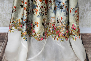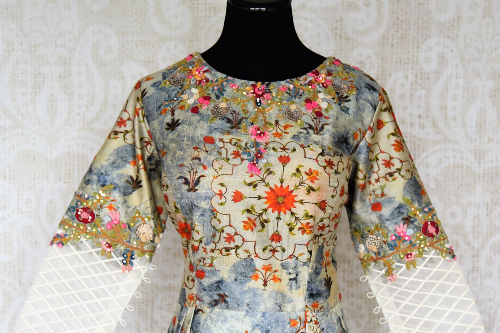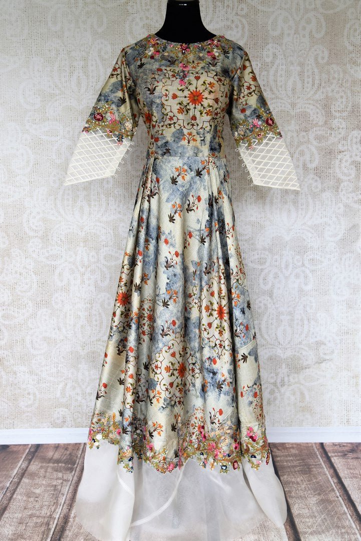 Feel the festive fervour in our exquisitely designed floor-length white silk floral embroidery dress. The intricate embroidery and cascading fall of the effortless drape look ethereal as ever. Don this Indo-western contemporary dress to family gatherings, soirees or formal events. Shop this suave indo-fusion dress at Pure Elegance store in USA.