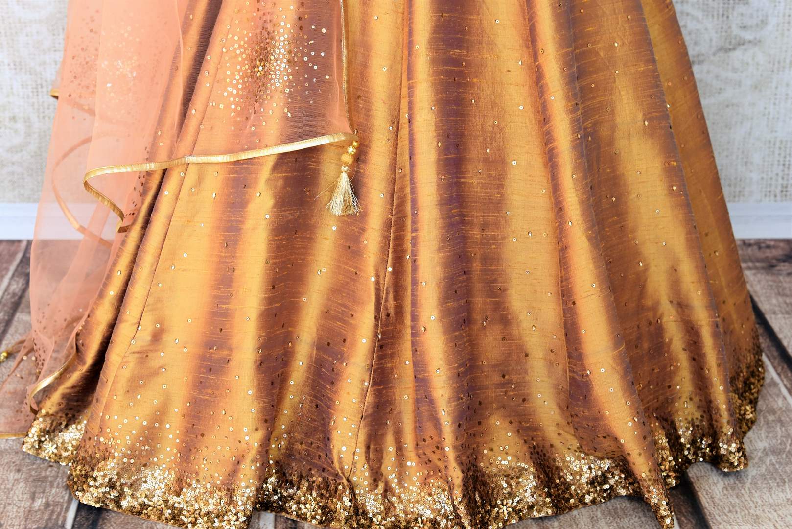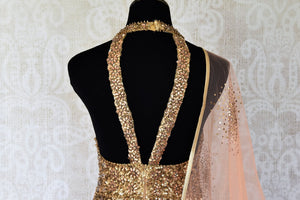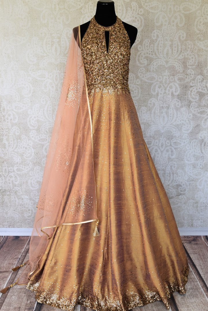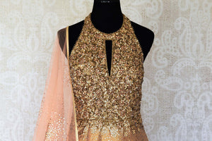 Leave them gaping in awe as you strut in this scintillating gold silk floor-length dress. The gorgeous sequins embroidered all over the dress complemented with a halter neck and peach sequin work dupatta looks nothing less than a dream. Shop designer anarkali suits, concept sarees, indowestern dresses online or visit Pure Elegance store, USA.