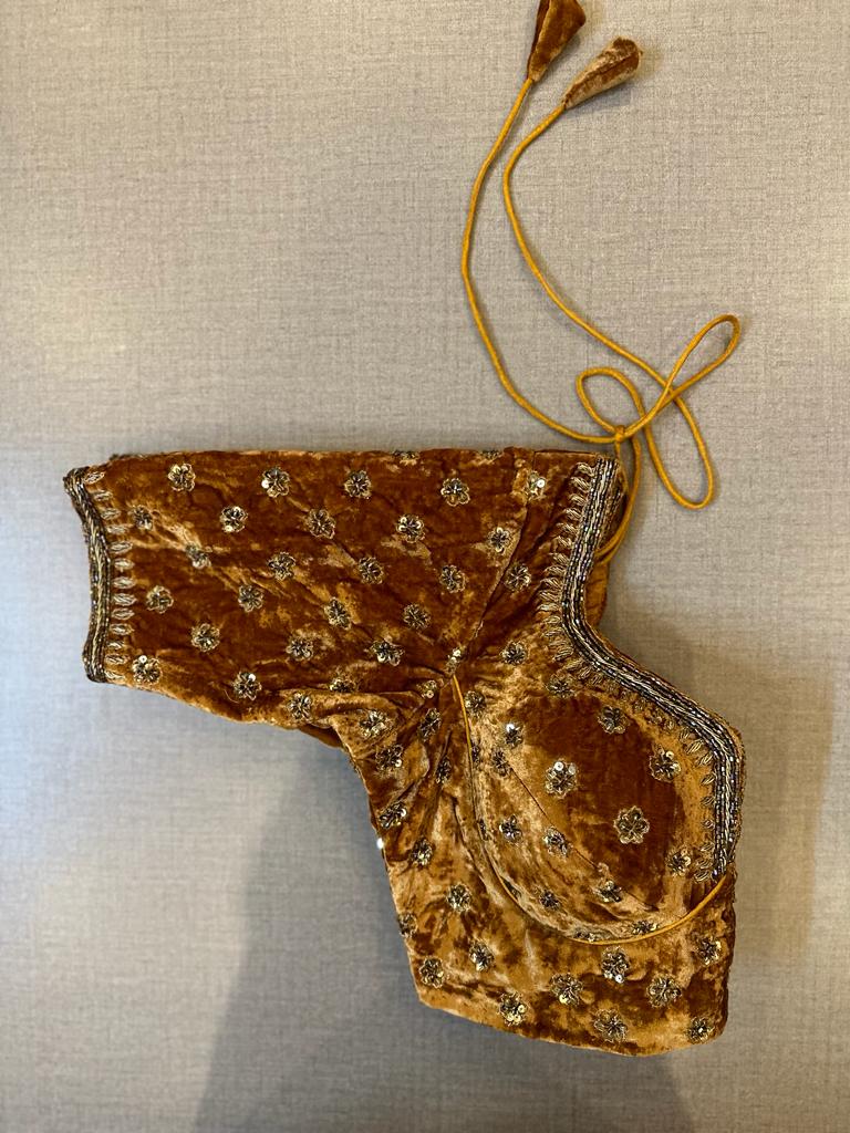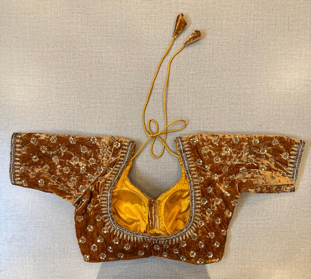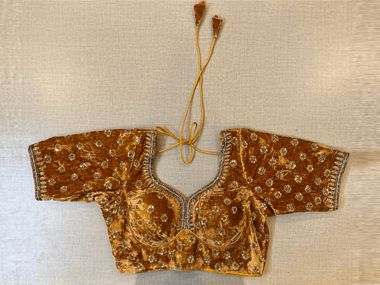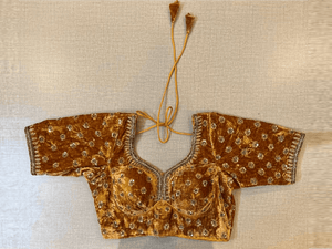 Beautiful golden embroidered velvet choli-cut saree blouse. Buy designer blouse in USA from Pure Elegance.