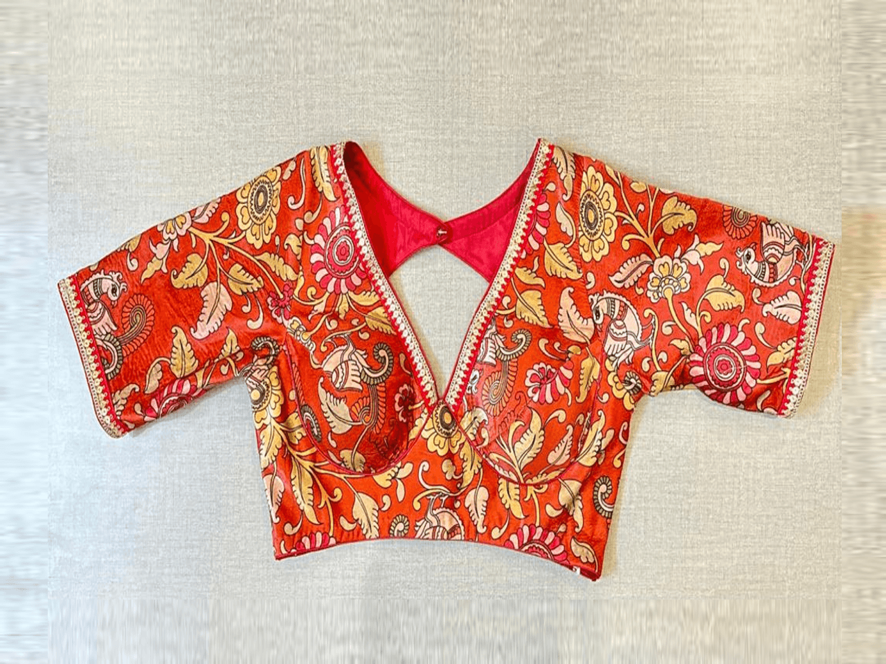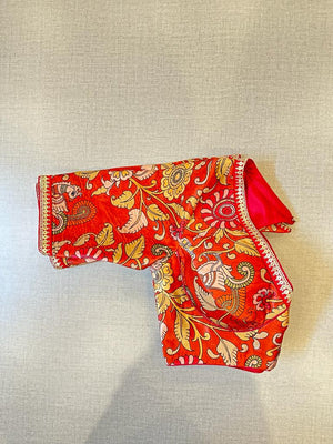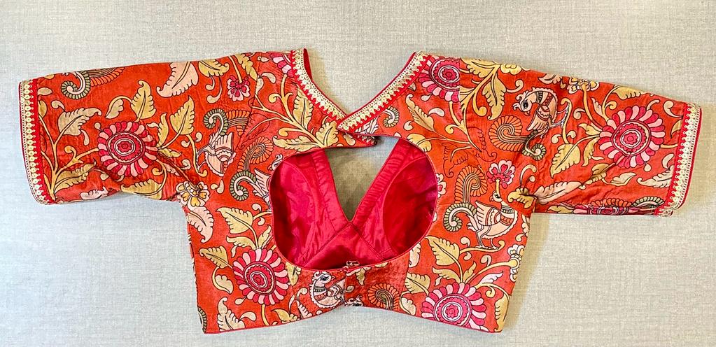 Beautiful bright red Kalamkari saree blouse with sequin lace. Buy designer blouse in USA from Pure Elegance.