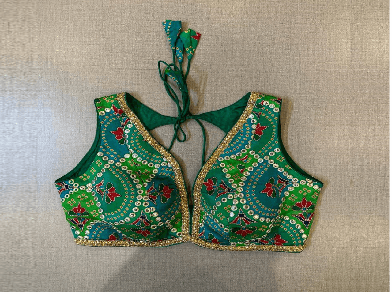 Beautiful green printed mirror work sleeveless saree blouse. Buy designer blouse in USA from Pure Elegance.