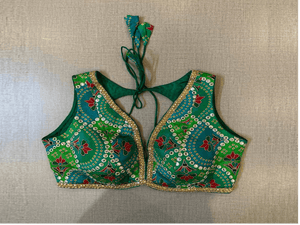 50V179-RO Green Printed Mirror Work Sleeveless Saree Blouse
