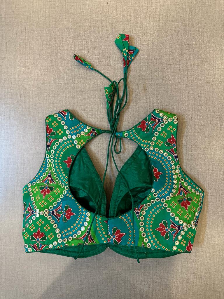 Buy beautiful green printed mirror work sleeveless saree blouse online in USA. Elevate your saree style with exquisite readymade saree blouses, embroidered saree blouses, Banarasi saree blouse, designer saree blouse, choli-cut blouses, corset blouses from Pure Elegance Indian clothing store in USA.-back