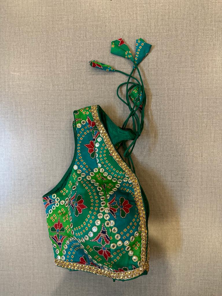 Buy beautiful green printed mirror work sleeveless saree blouse online in USA. Elevate your saree style with exquisite readymade saree blouses, embroidered saree blouses, Banarasi saree blouse, designer saree blouse, choli-cut blouses, corset blouses from Pure Elegance Indian clothing store in USA.-full view