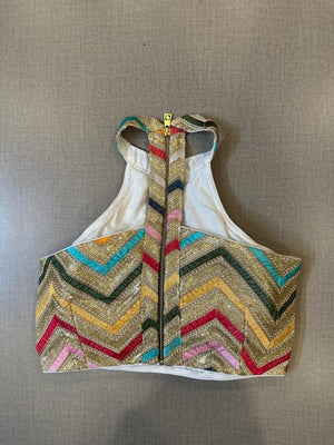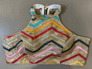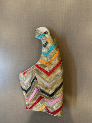Beautiful white and golden embroidery halter neck saree blouse. Buy designer blouse in USA from Pure Elegance.