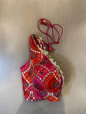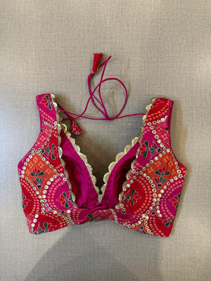 Beautiful red and pink printed mirror work sleeveless saree blouse. Buy designer blouse in USA from Pure Elegance.