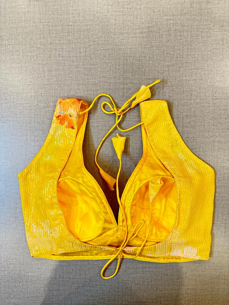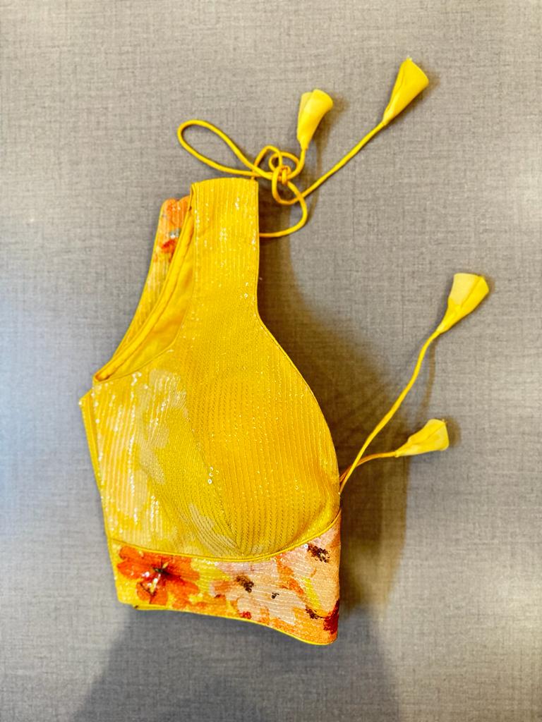 Beautiful yellow floral sequin work sleeveless saree blouse. Buy designer blouse in USA from Pure Elegance.