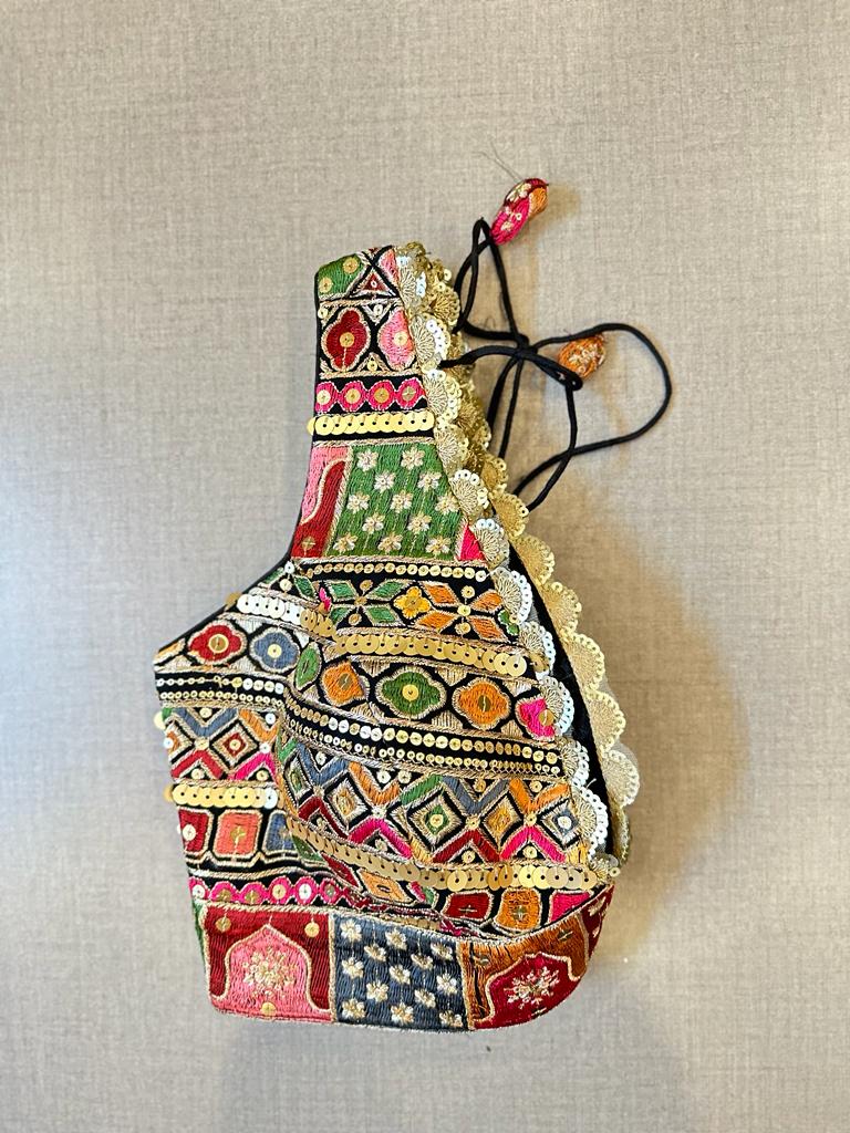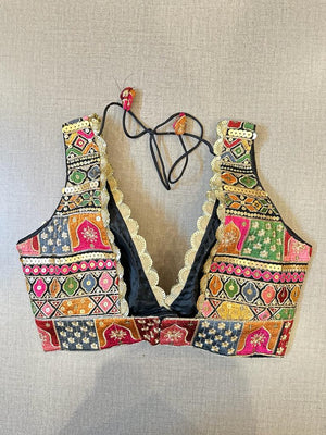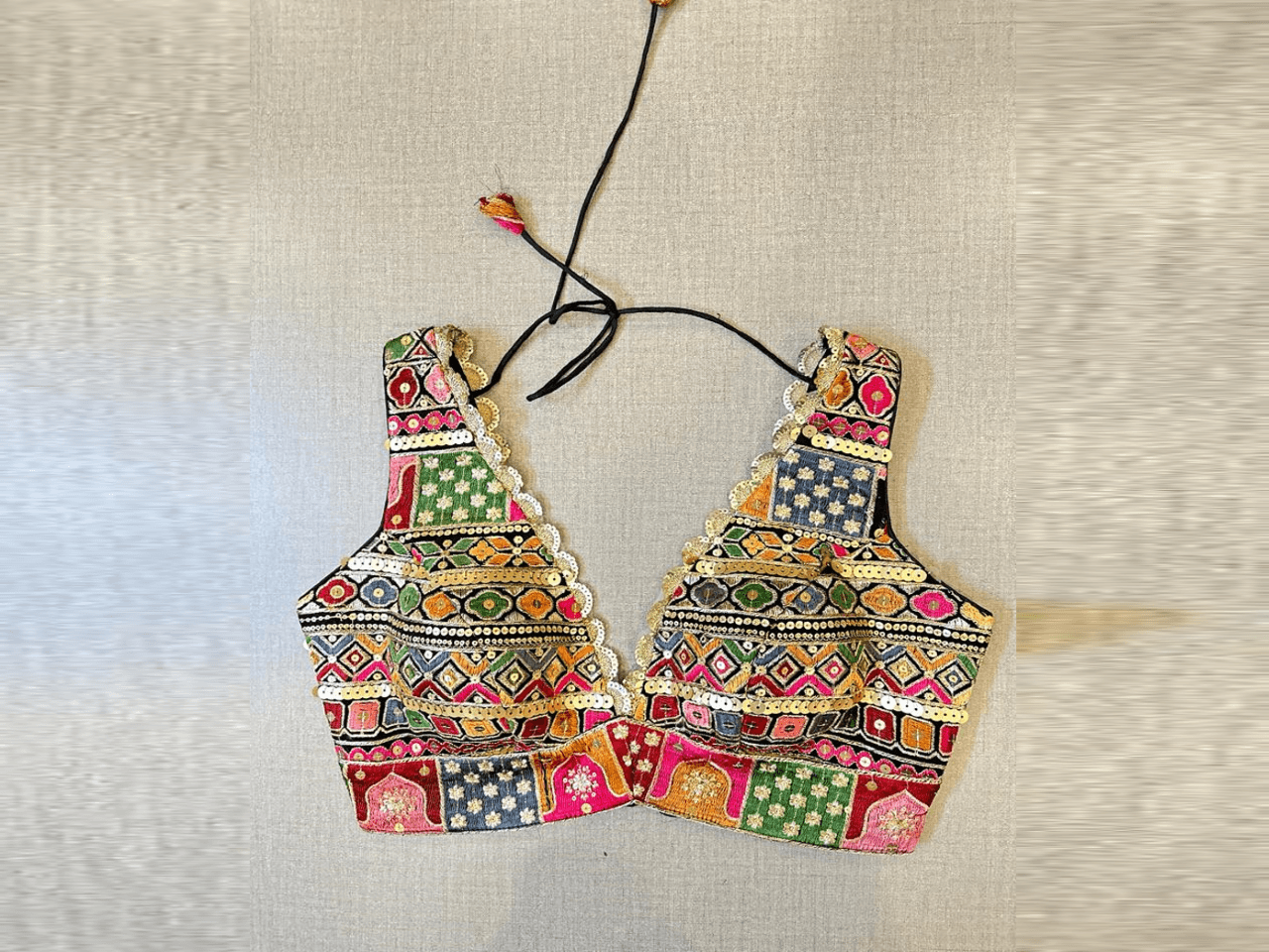 Beautiful black multicolor embroidery sleeveless blouse with scalloping lace. Buy designer blouse in USA from Pure Elegance.