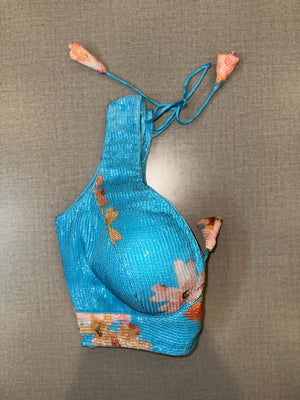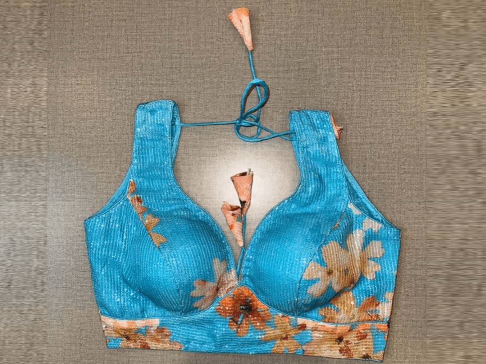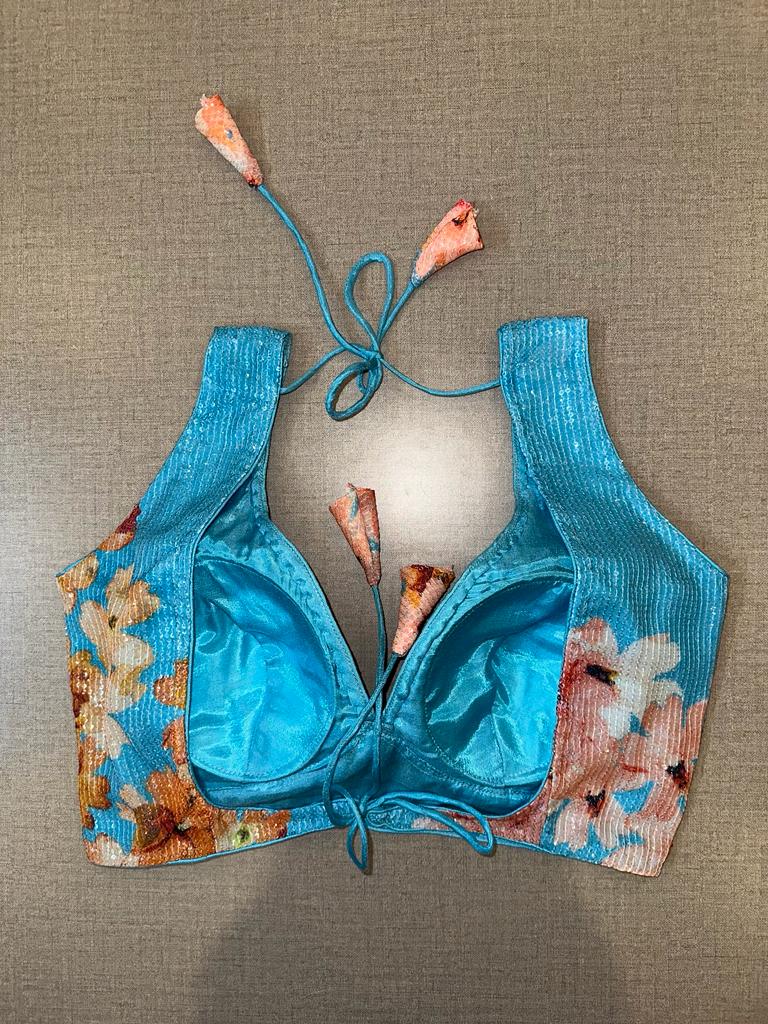 Beautiful turquoise blue floral sequin work sleeveless saree blouse. Buy designer blouse in USA from Pure Elegance.
