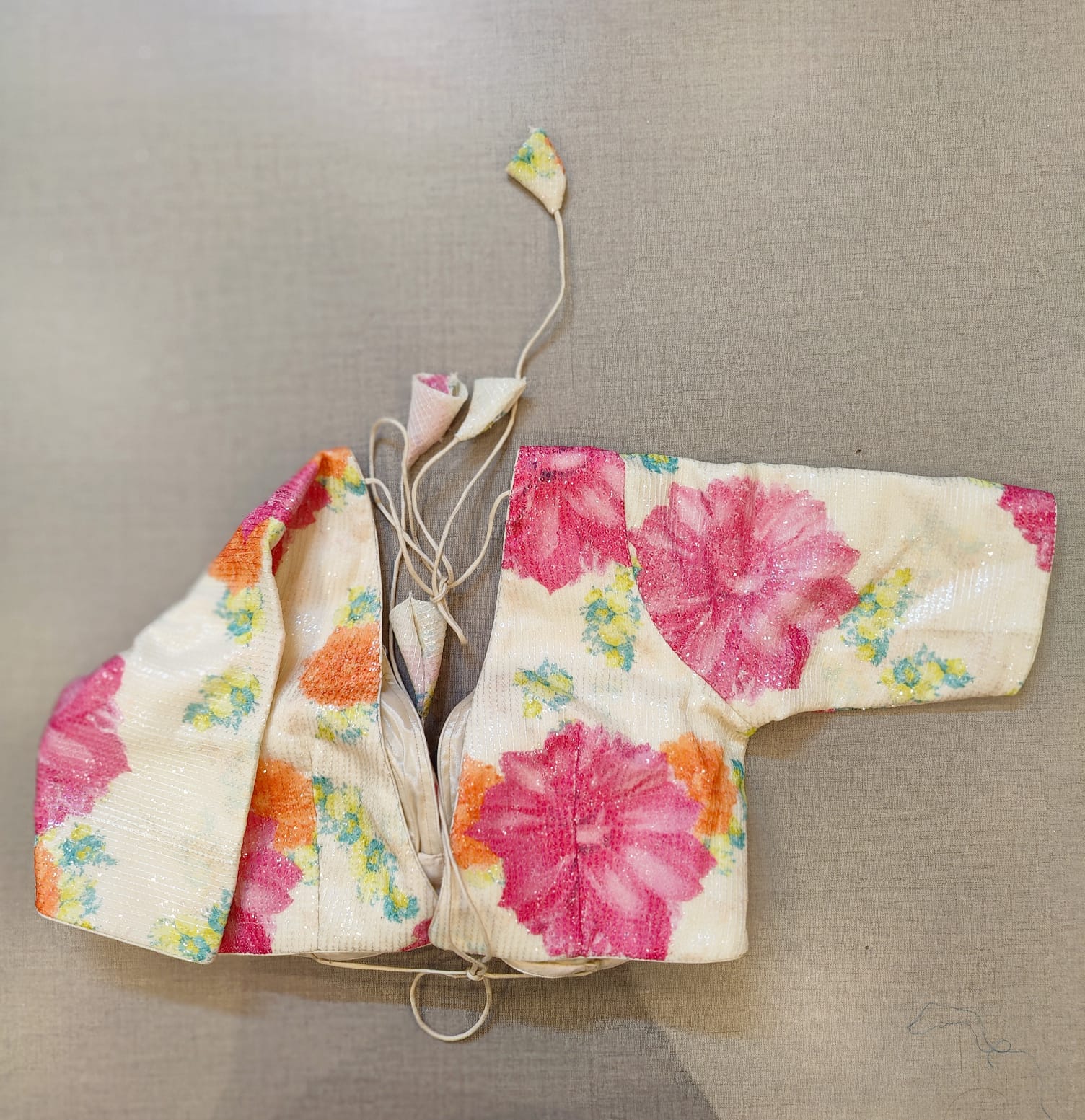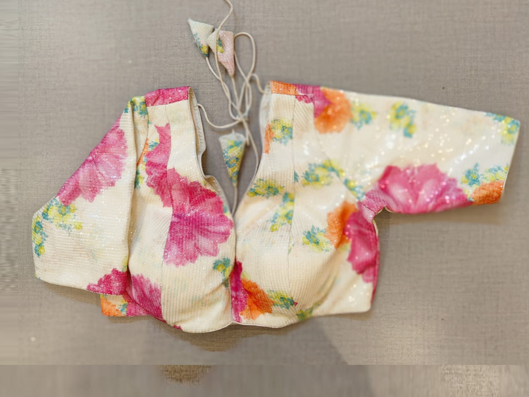 Beautiful white sequin floral saree blouse. Buy designer blouse in USA from Pure Elegance.