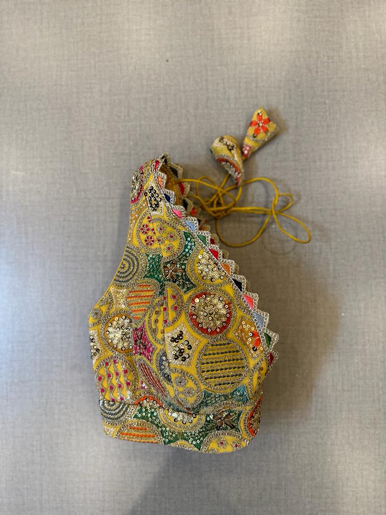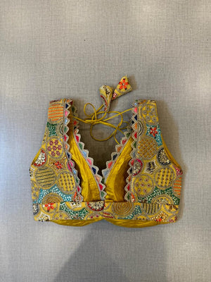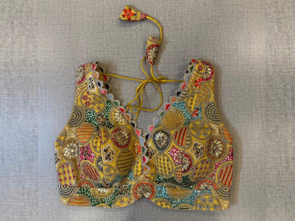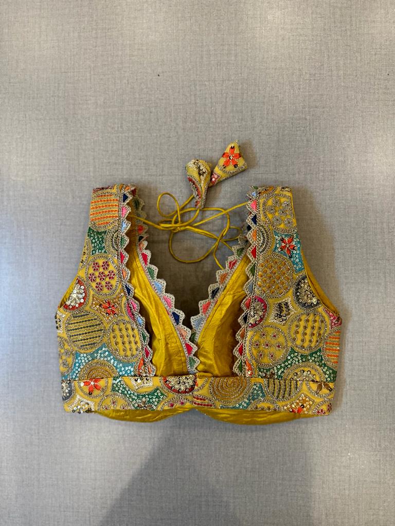 Elegant yellow multicolor embroidery sleeveless saree blouse. Buy designer blouse in USA from Pure Elegance.
