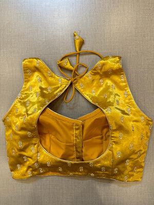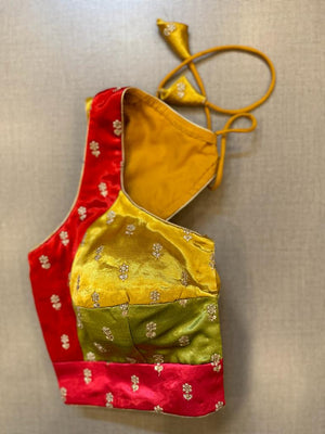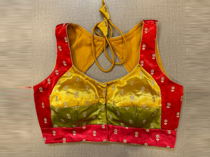 Elegant yellow and red embroidered choli cut saree blouse. Buy designer blouse in USA from Pure Elegance.