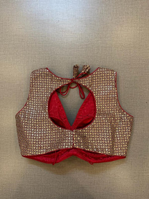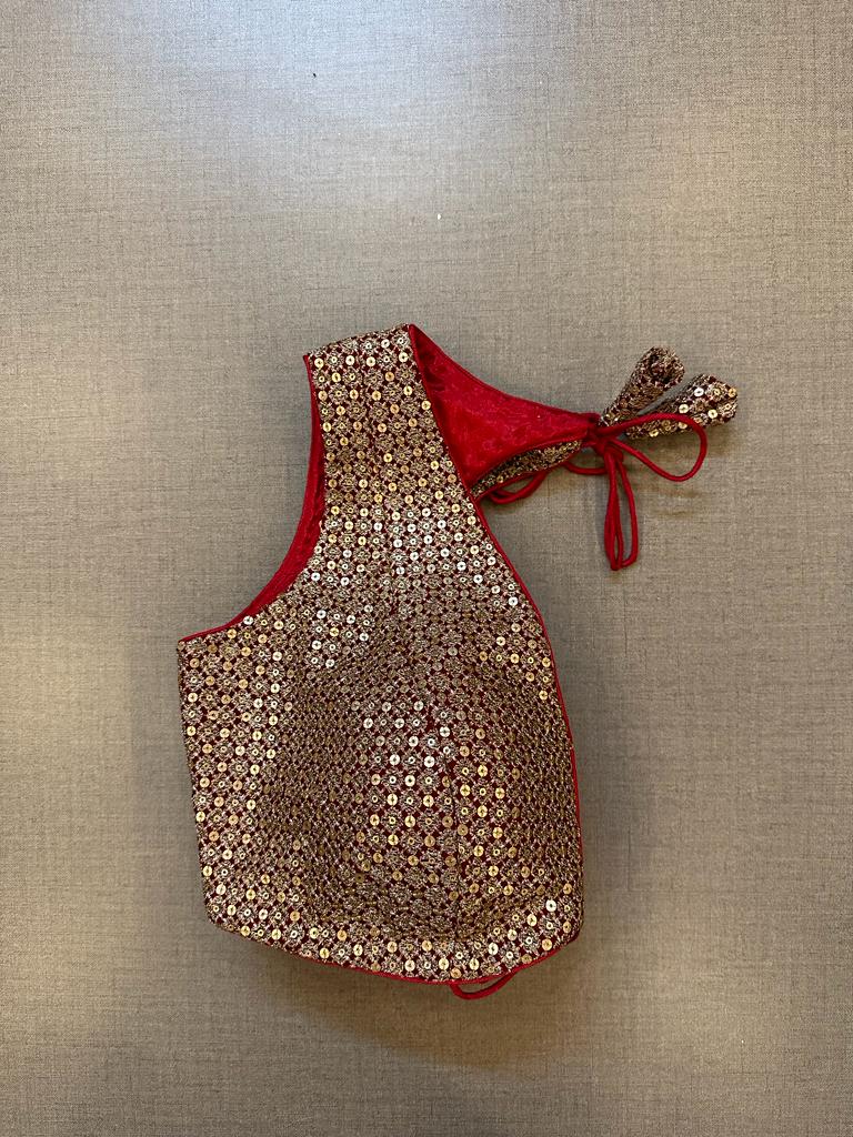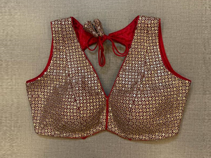 Elegant red sequin embroidery sleeveless saree blouse. Buy designer blouse in USA from Pure Elegance.