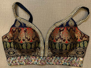 Beautiful black Banarasi strappy sari blouse with mirror lace. Buy designer blouse in USA from Pure Elegance.