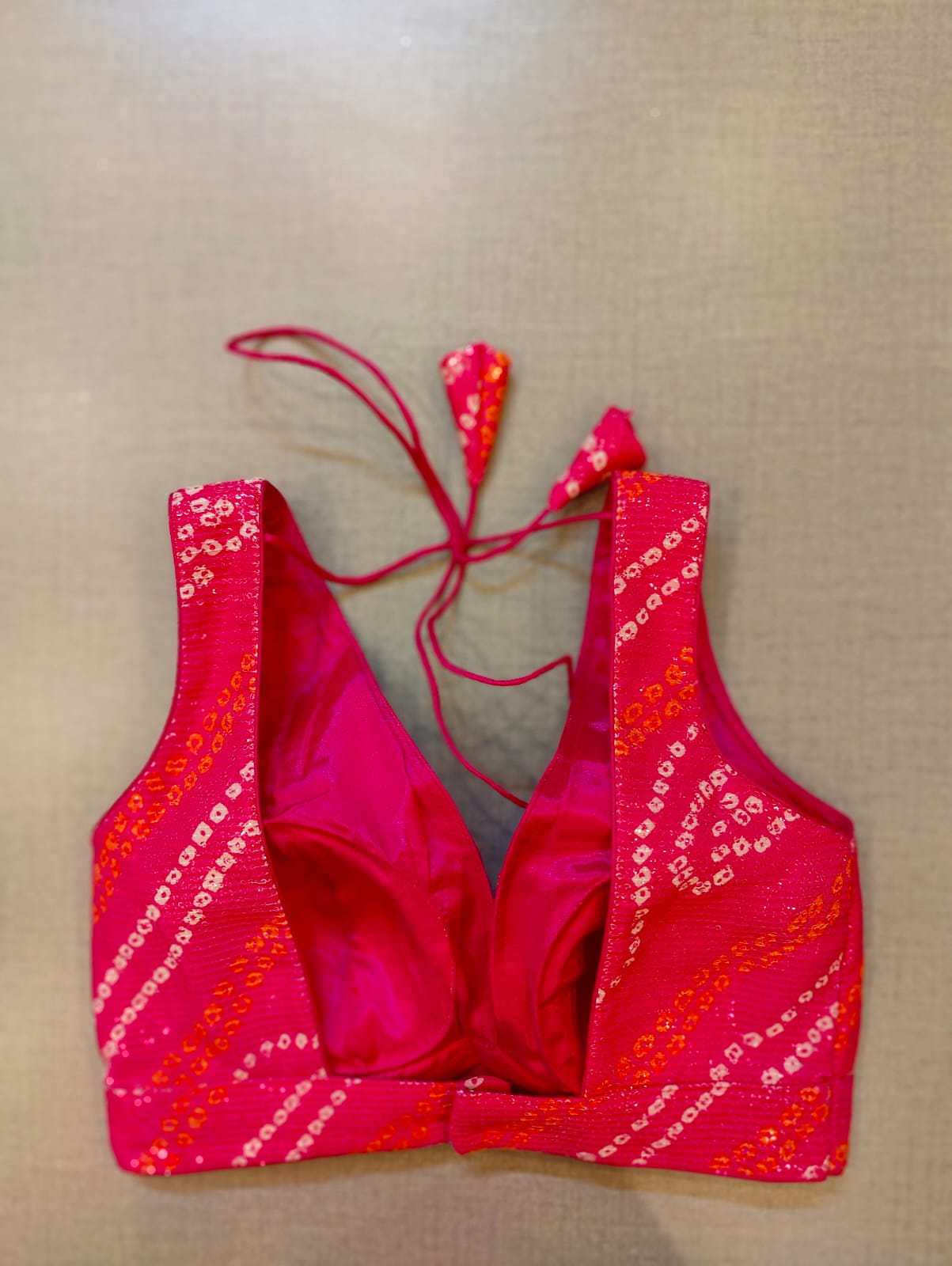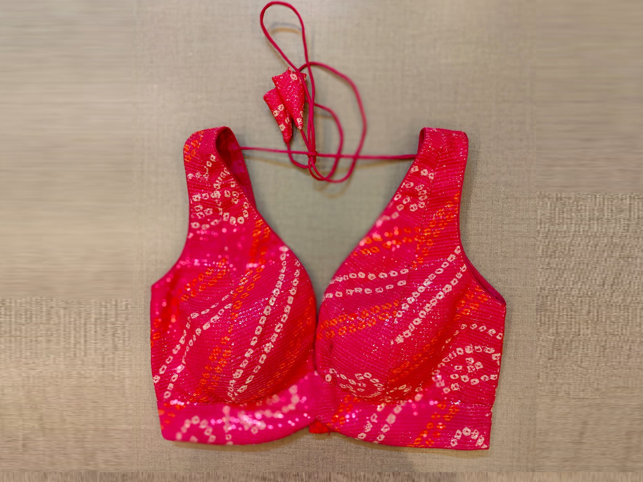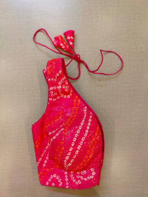 Beautiful pink sequin bandhej sleeveless saree blouse. Buy designer blouse in USA from Pure Elegance.
