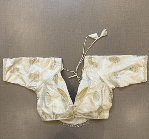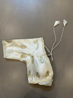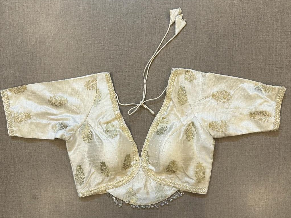 Beautiful cream designer sari blouse with floral zari buta and pearl work lace. Buy designer blouse in USA from Pure Elegance.